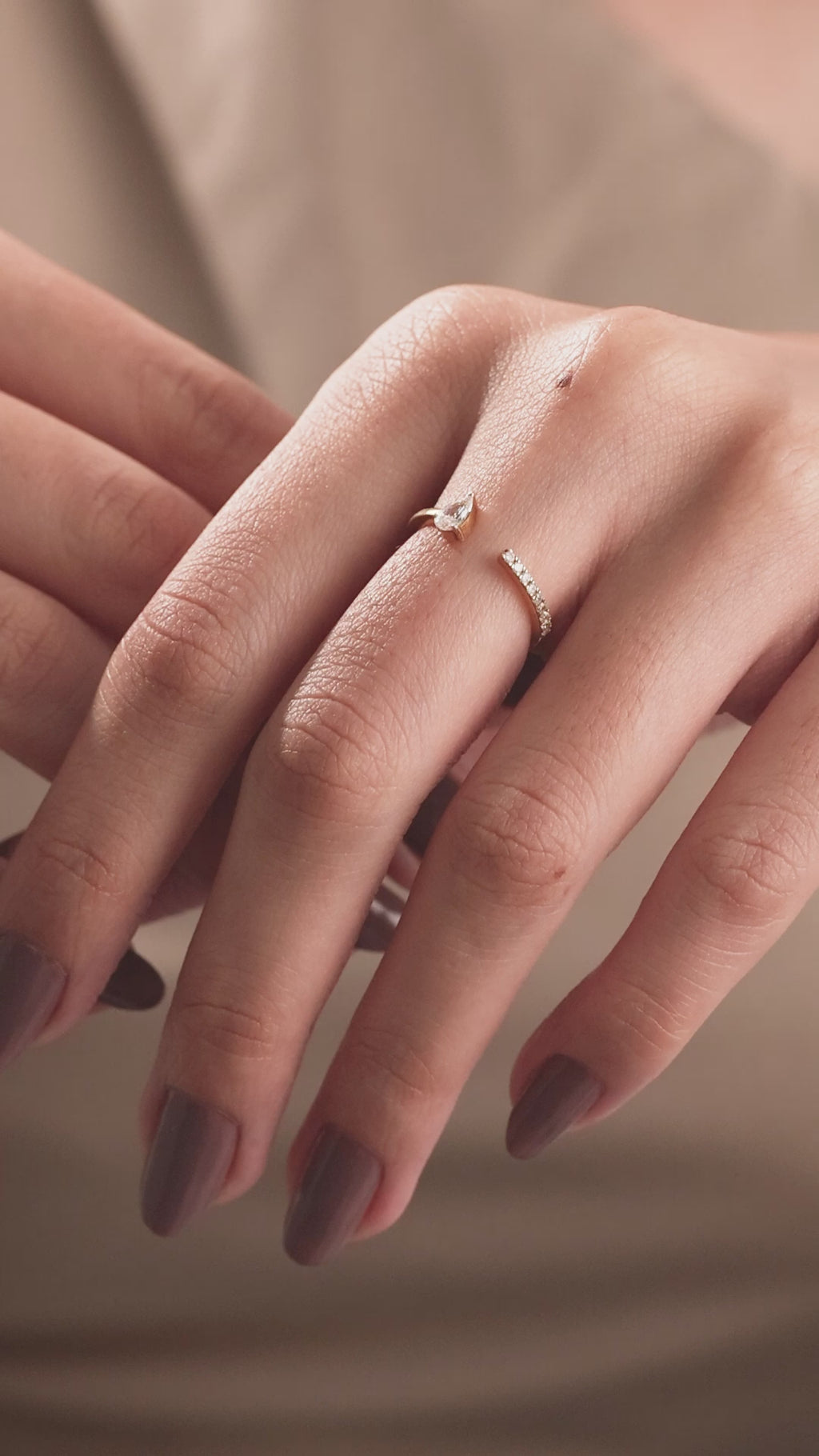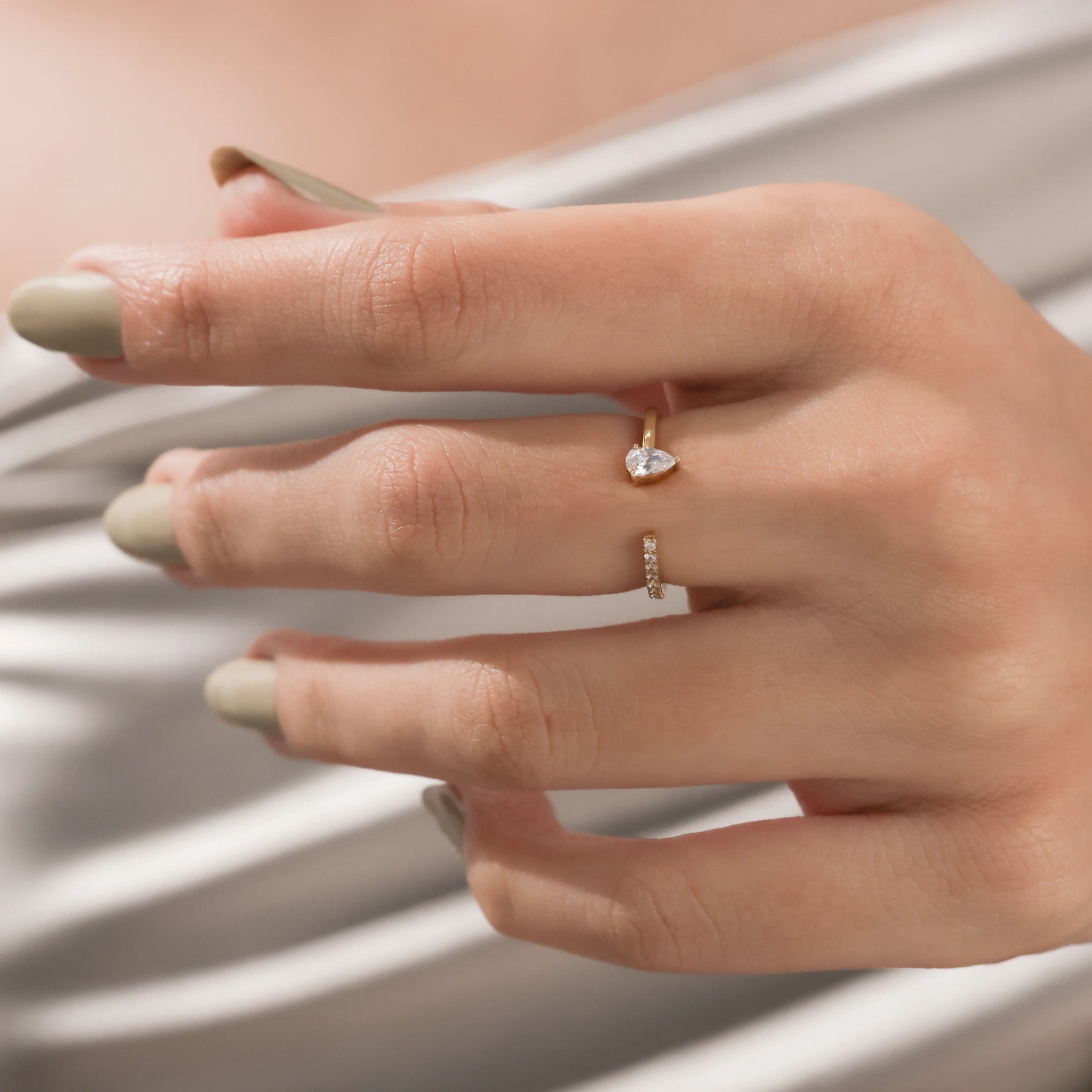 Open Pear Diamond ring features an open gap in the center. One side with a 0.15 CT pear solitaire in a three prong setting, while the other side sparkles with 9 round brilliant-cut diamonds set in a micro-pave setting, creating a unique and eye-catching design.