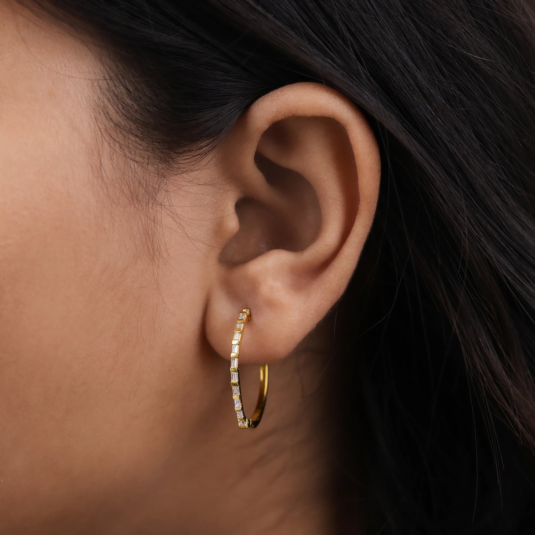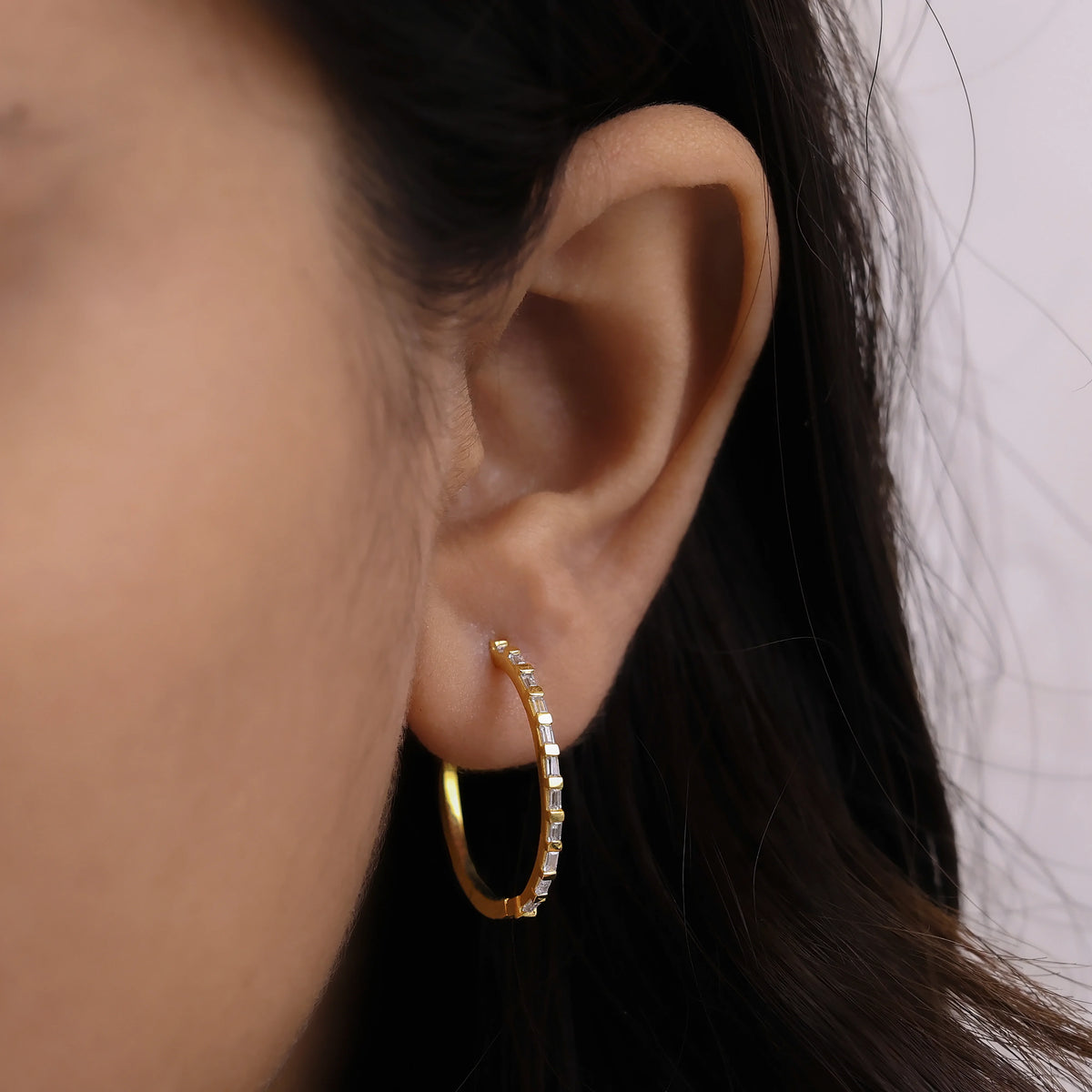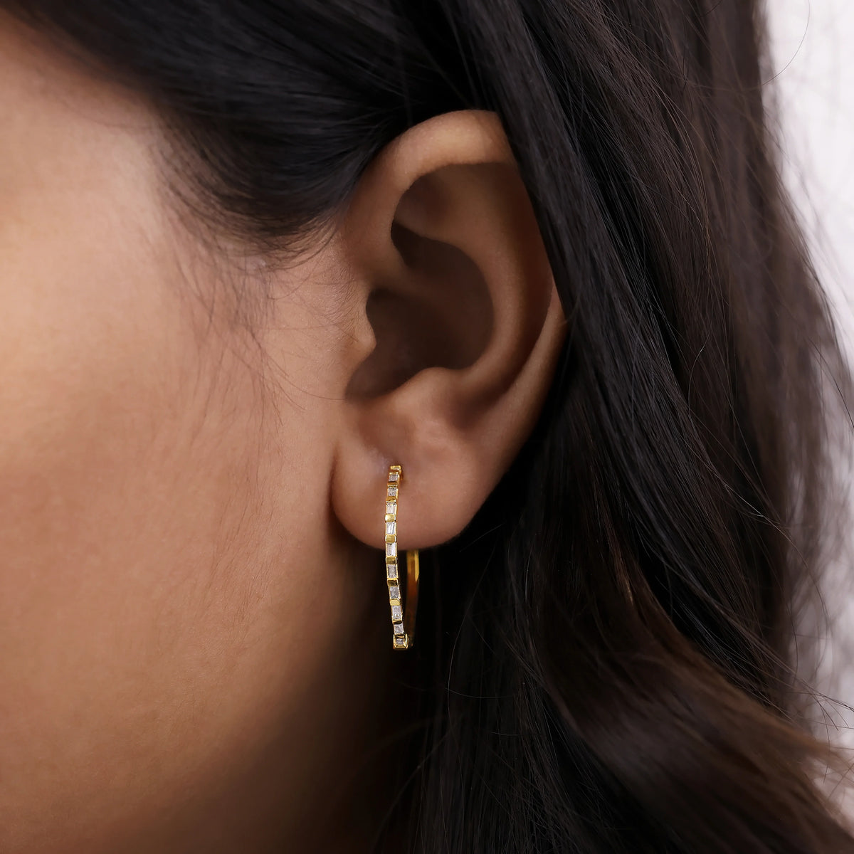0.33 CT lab grown diamond baguette hoop earrings set in a bar setting.