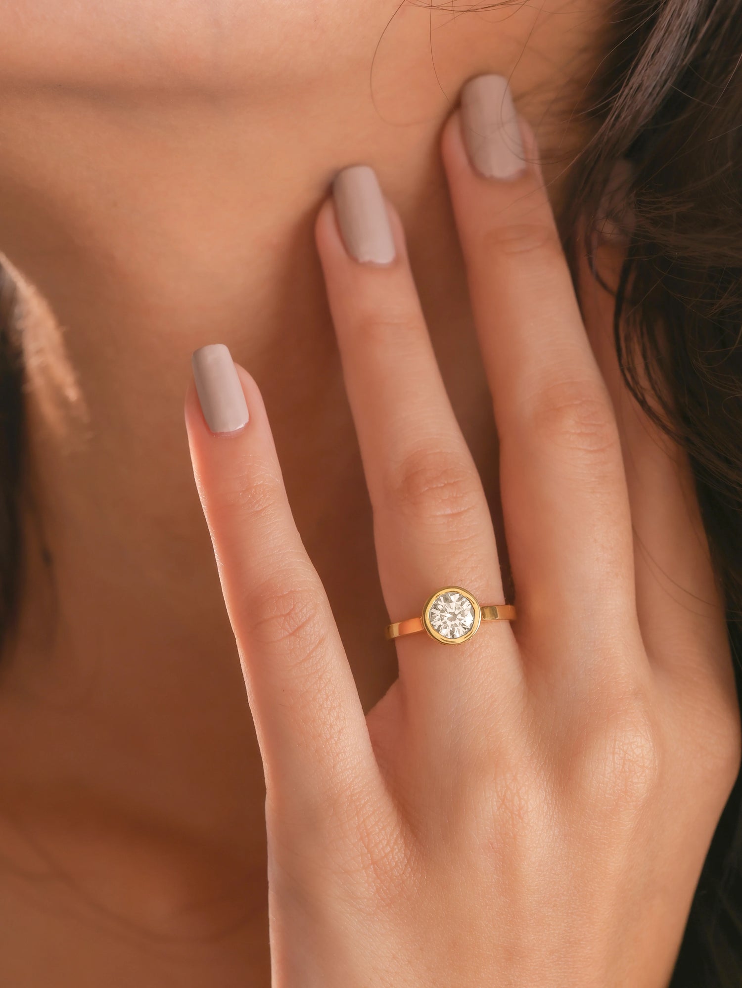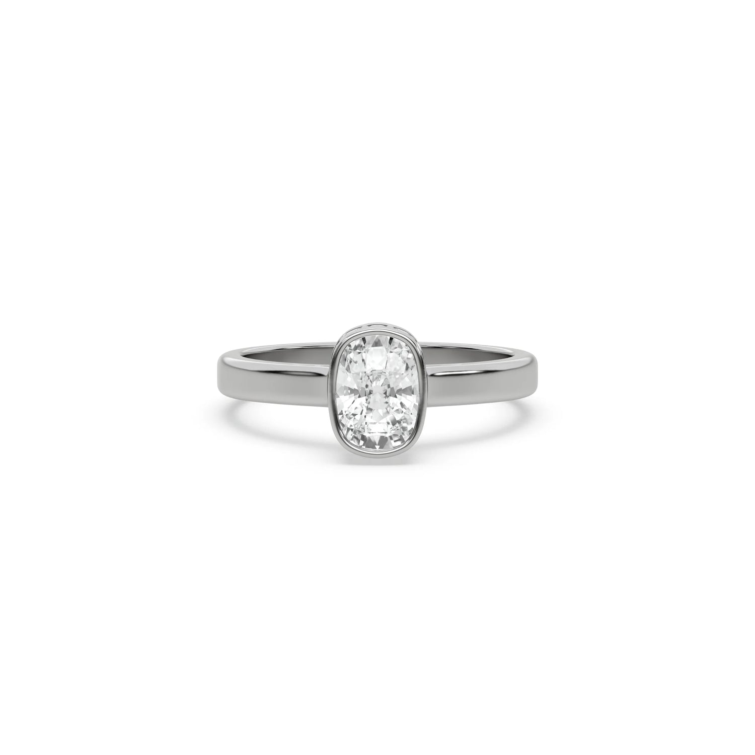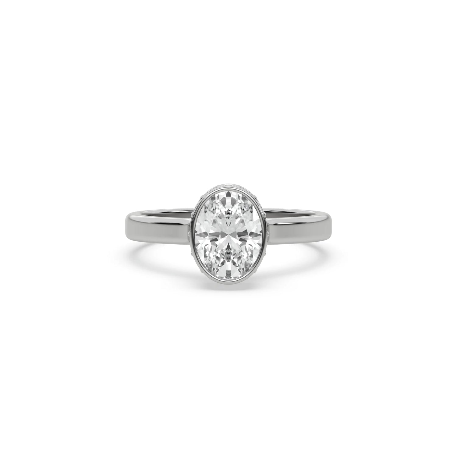 Oval Diamond Bezel Engagement Ring is made with an oval cut diamond set in a bezel setting on a solid gold band.