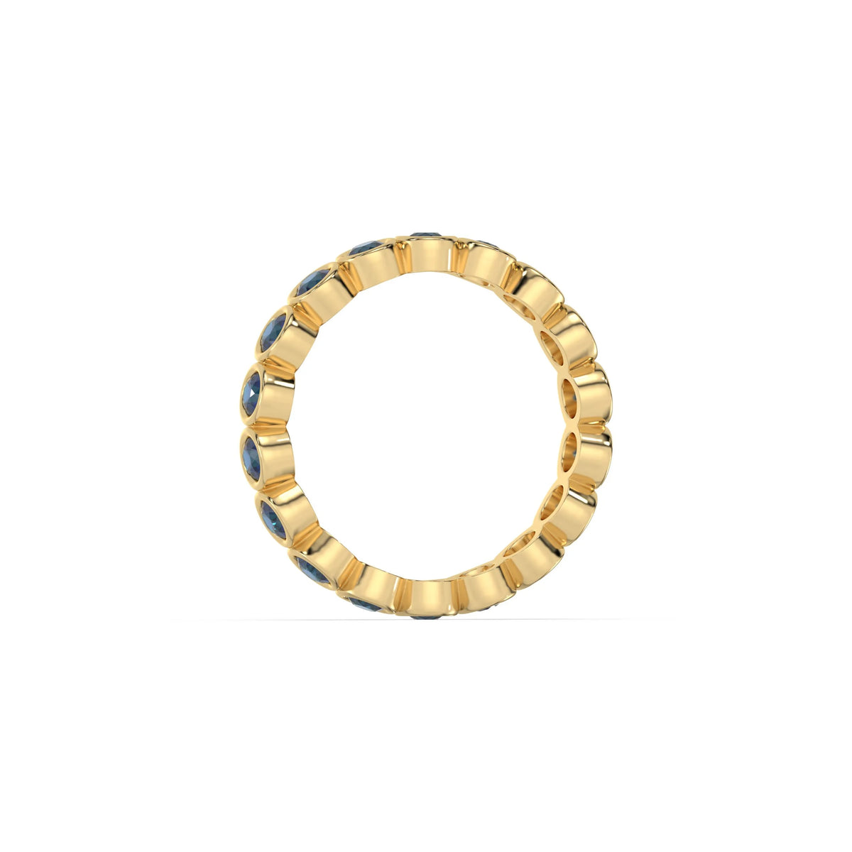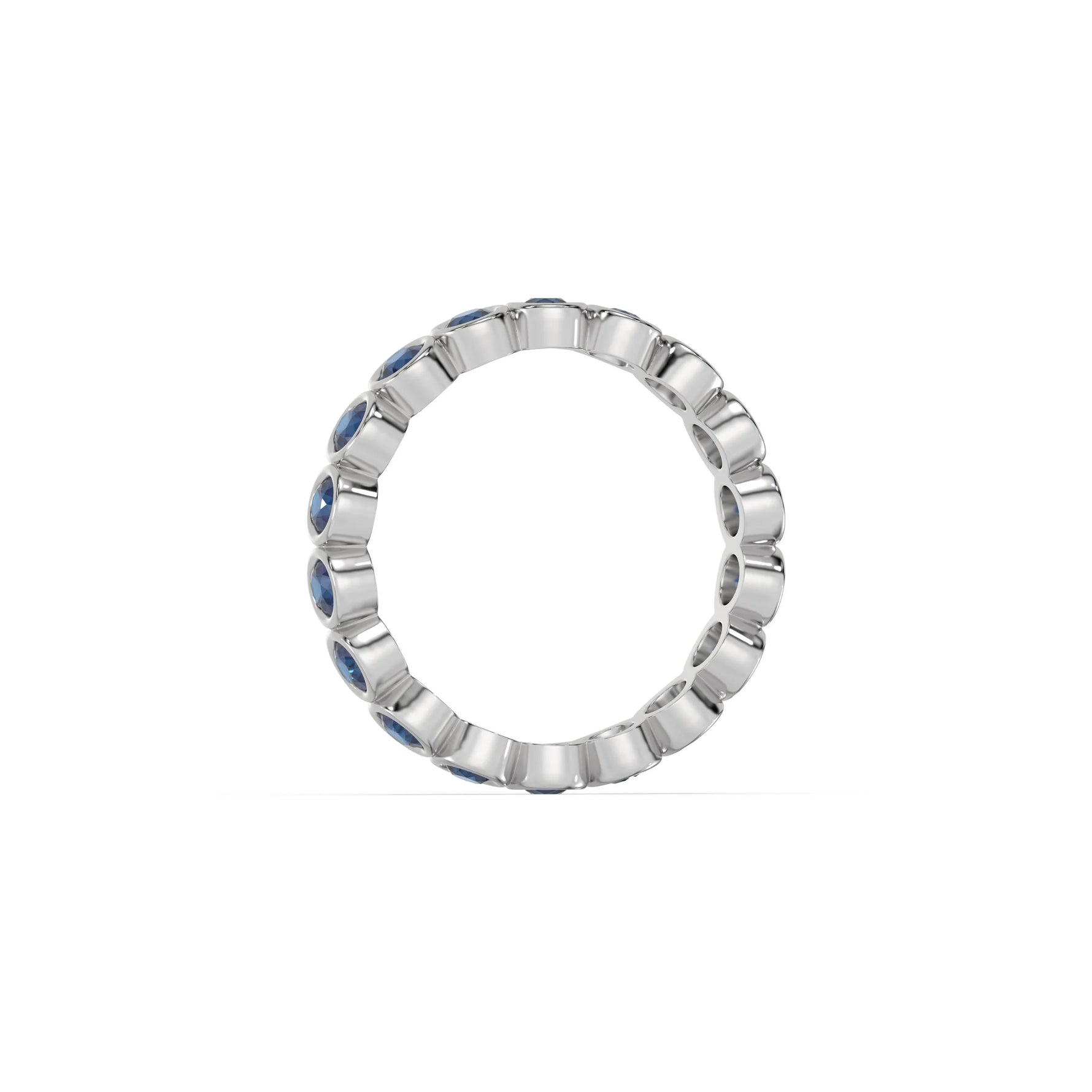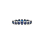This 3 mm full eternity band features approximately 0.70 carats of round natural blue sapphire gemstones set in a bezel setting.