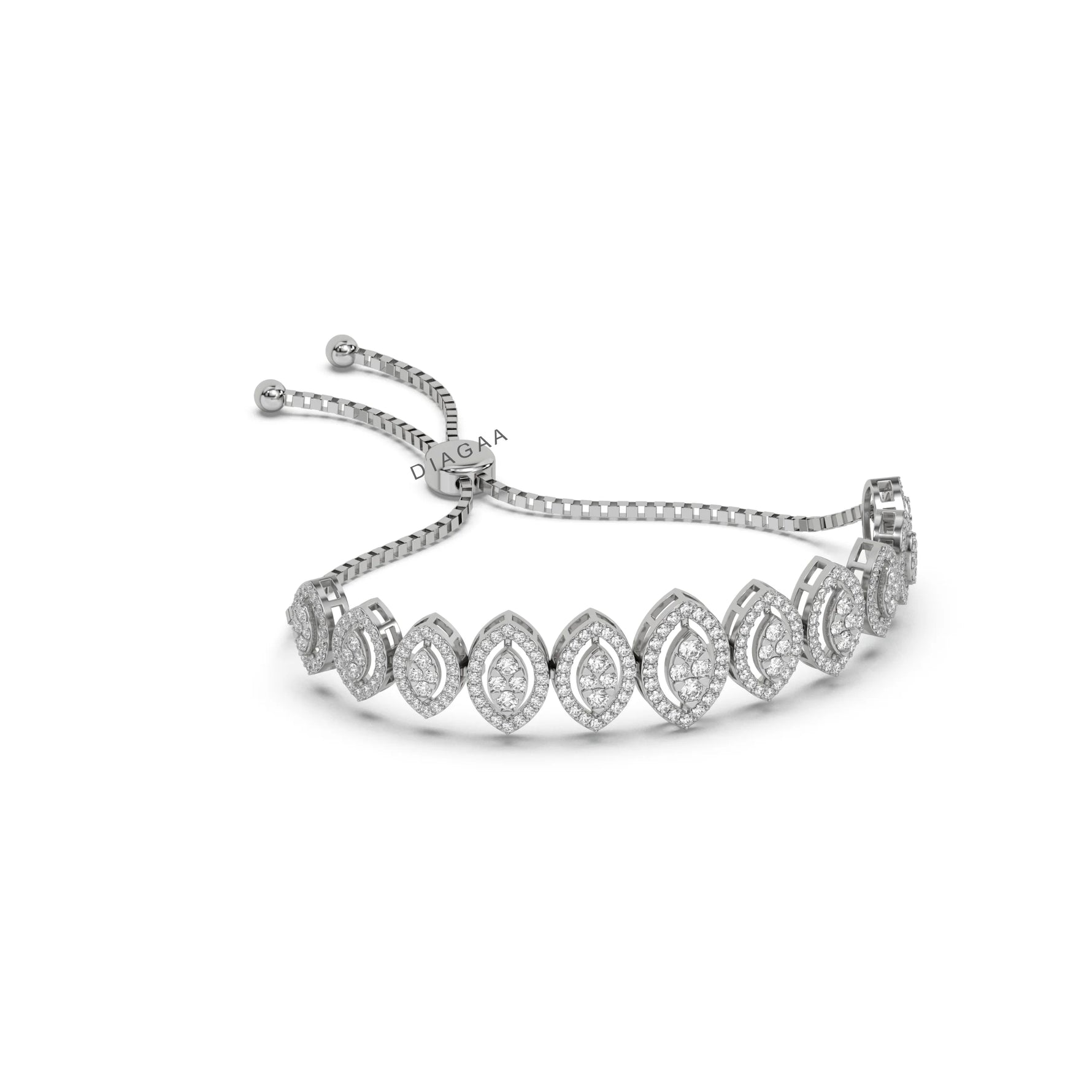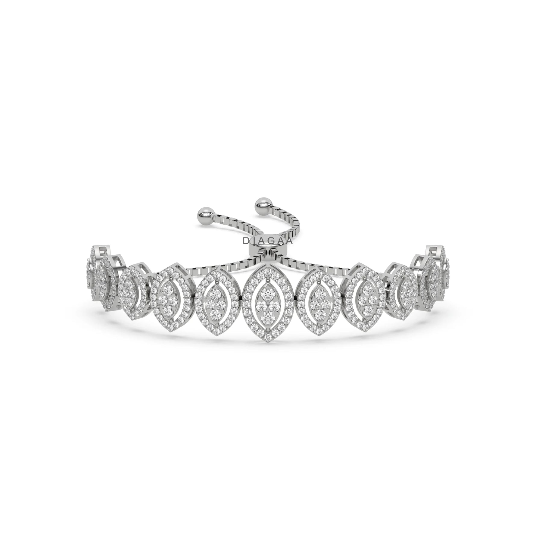 This Marquise Halo link bracelet features marquise-shaped links, each with a halo of round diamonds. The center of each marquise is formed by round diamonds in a pressure setting. The bracelet is finished with a chain and a bolo lock.