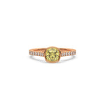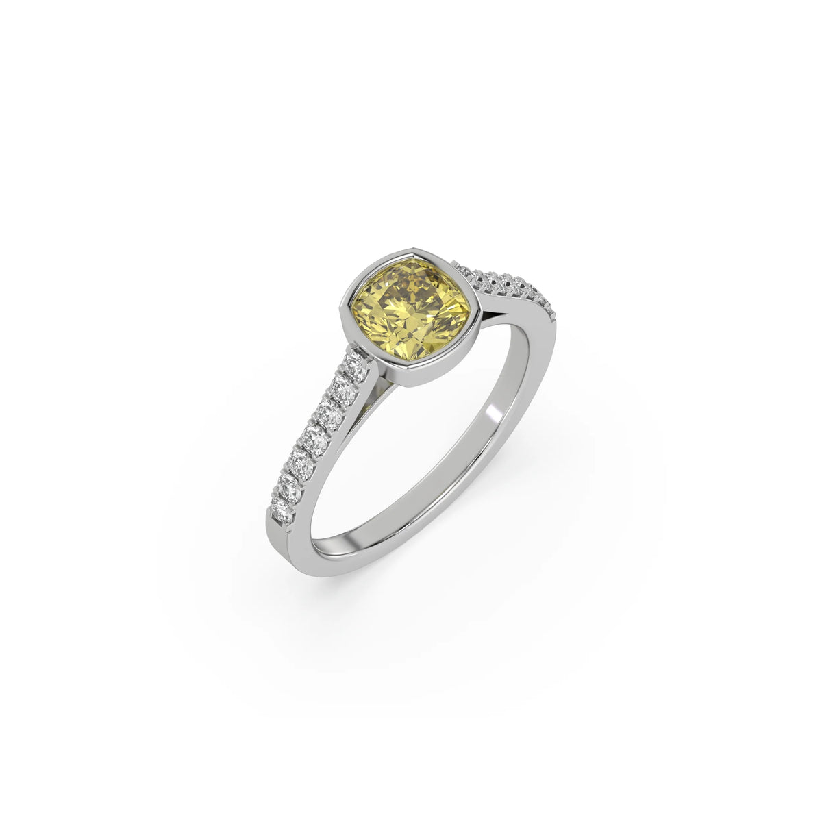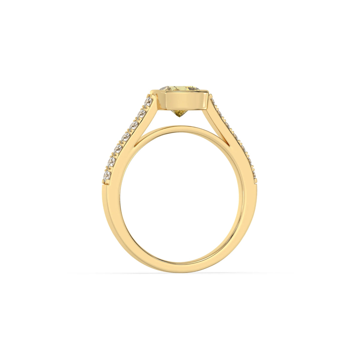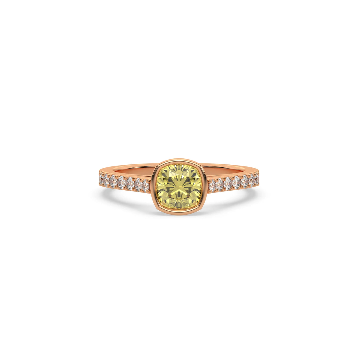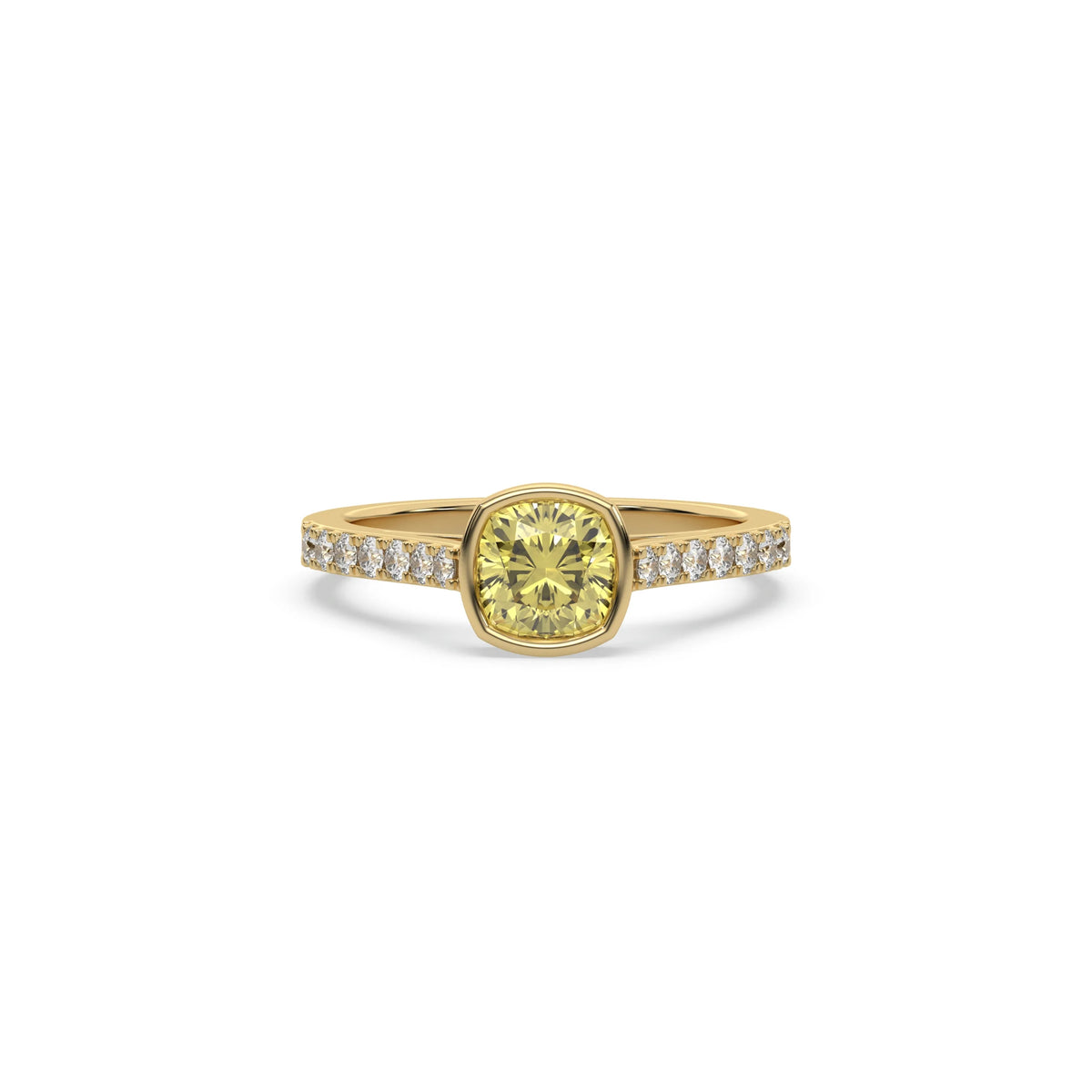 Fancy Yellow Cushion Diamond Bezel Engagement Ring is made with a fancy yellow cushion cut diamond set in a bezel setting on a pave diamond band made with round brilliant cut diamonds.