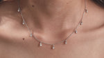 Round Dangling Diamond Necklace made with nine round brilliant-cut diamond set in a prong setting, distributed evenly along the chain.