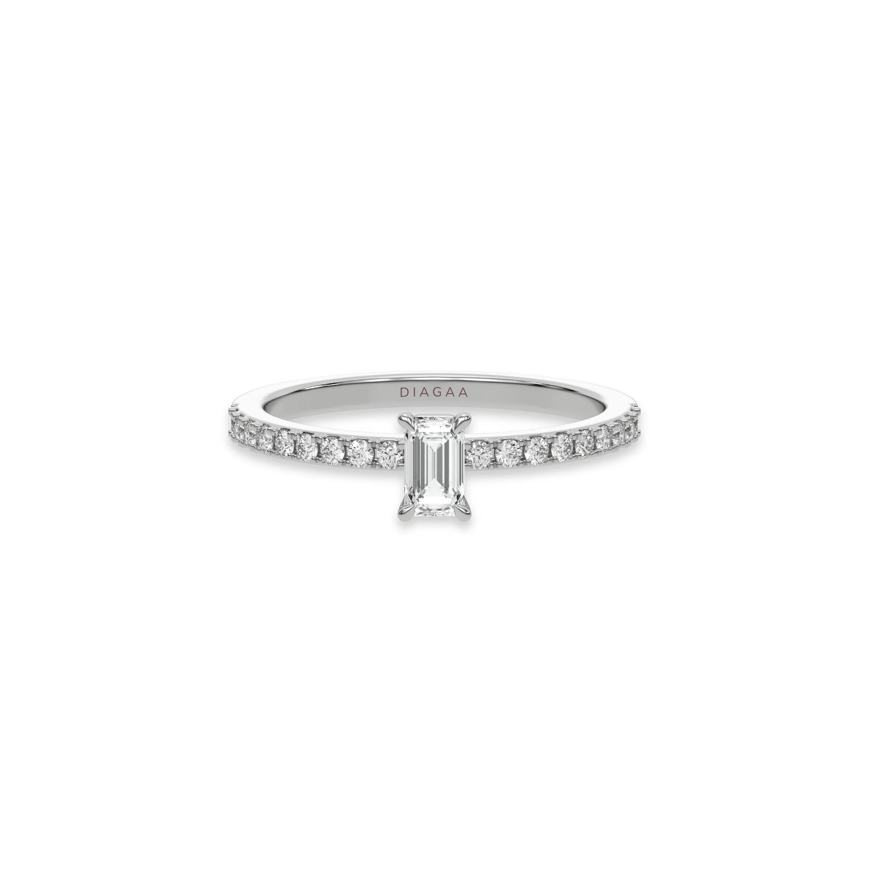 This ring is made with an emerald solitaire diamond set in four-prong setting, and is complemented by a round pave diamonds band.