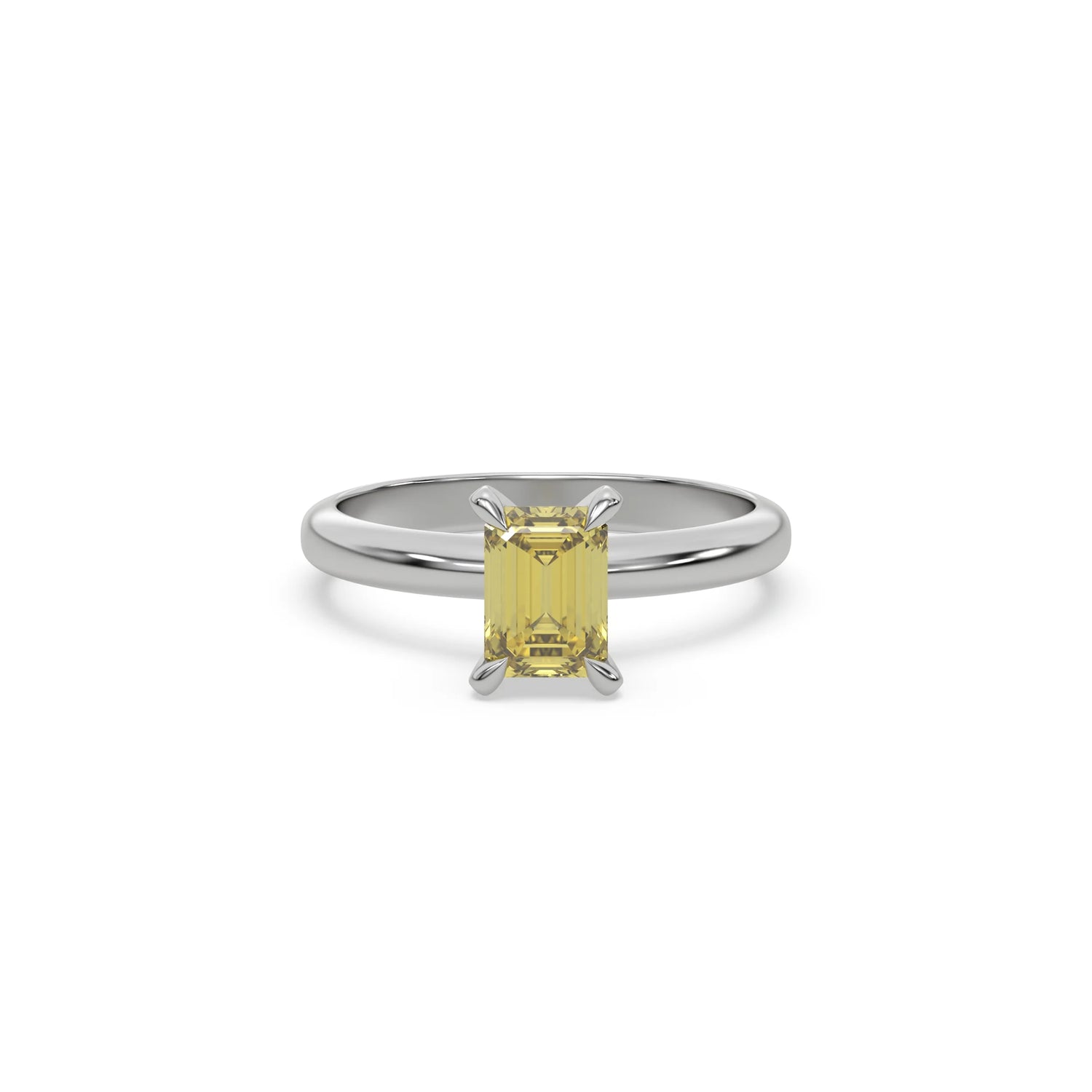 This ring features an fancy yellow emerald solitaire diamond elegantly secured in a four-prong setting on a solid gold band for a classic and timeless look.
