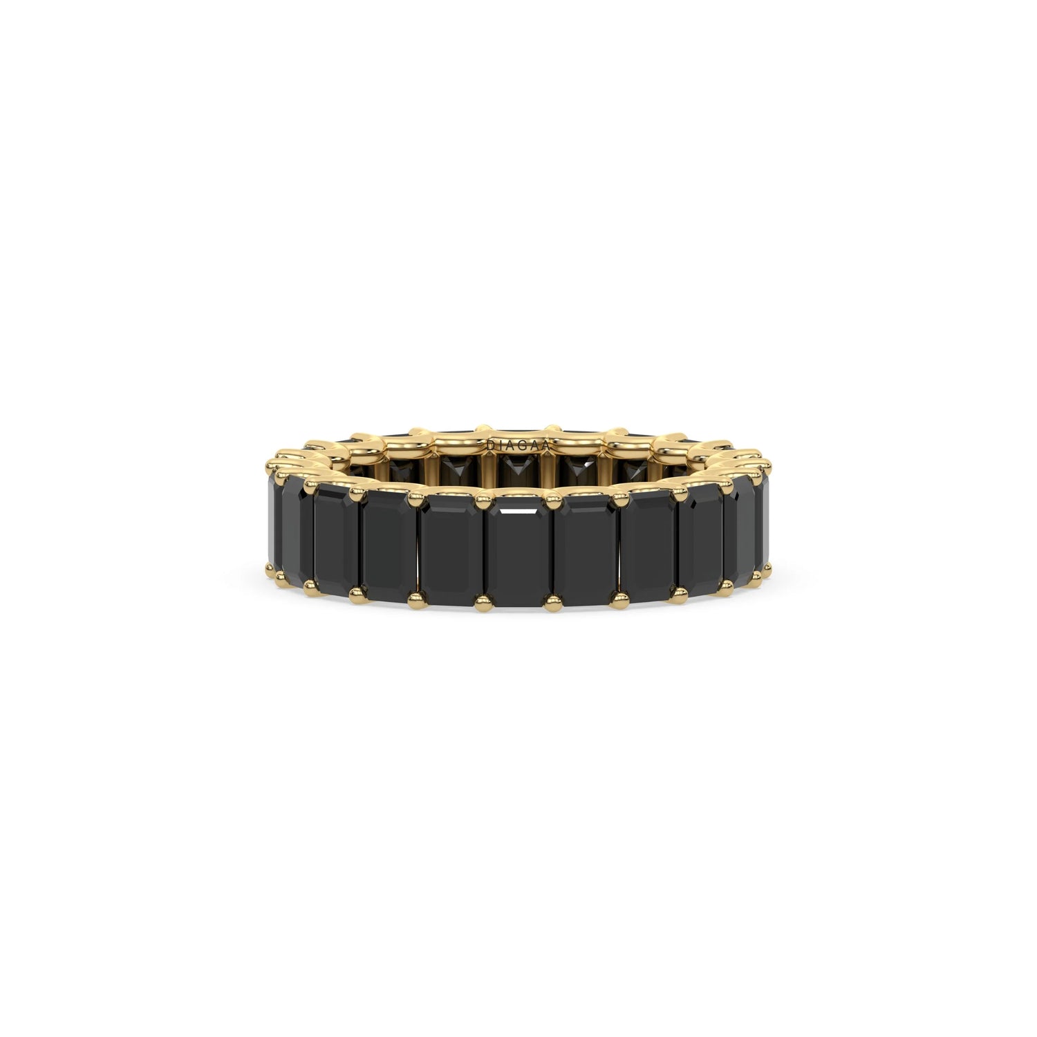 This 5 mm full eternity band features approximately 6.60 carats of emerald cut natural black diamond set in prong setting.