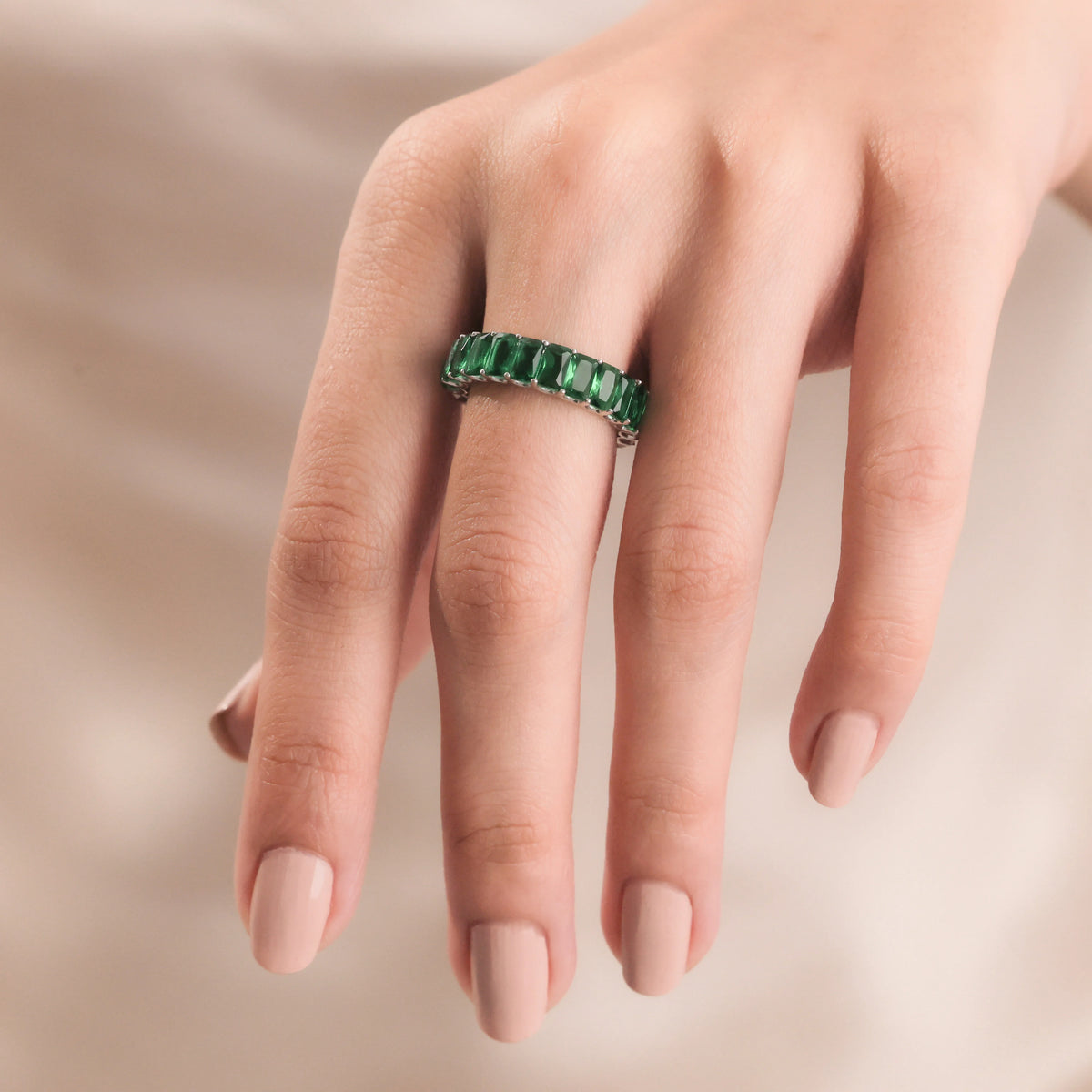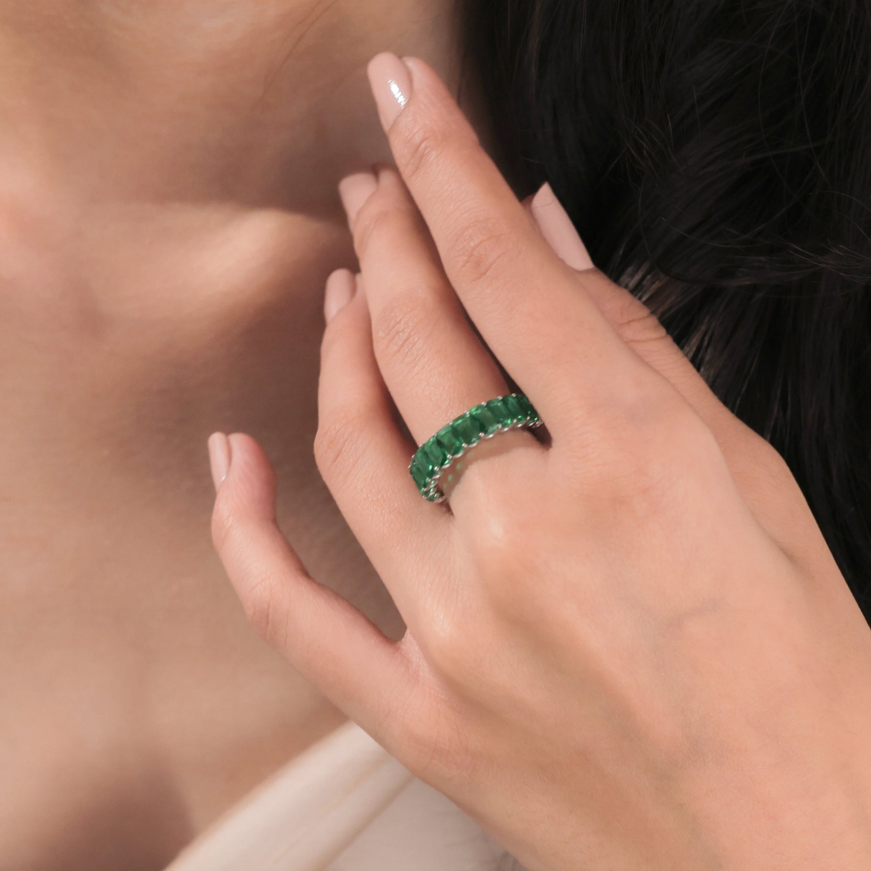 This 6 mm full eternity band features approximately 8.00 carats of Emerald cut lab created  emerald gemstones set in prong setting.
