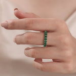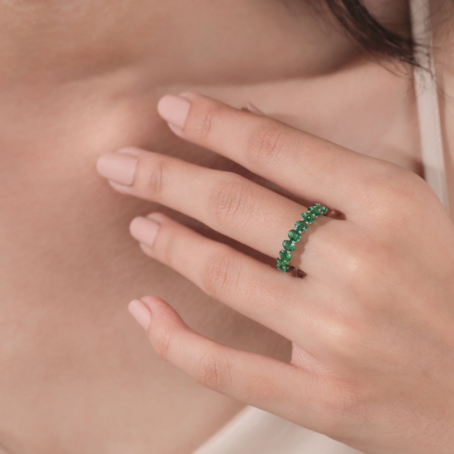 This 5 mm full eternity band features approximately 4.20 carats of oval natural emerald gemstones set in shared prong setting.