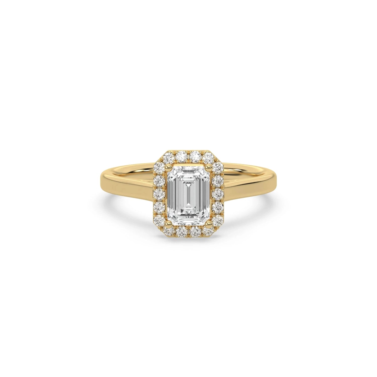 This ring is made with an emerald solitaire diamond set in a four-prong setting, surrounded by a halo of round diamonds, all resting on a delicate gold band.