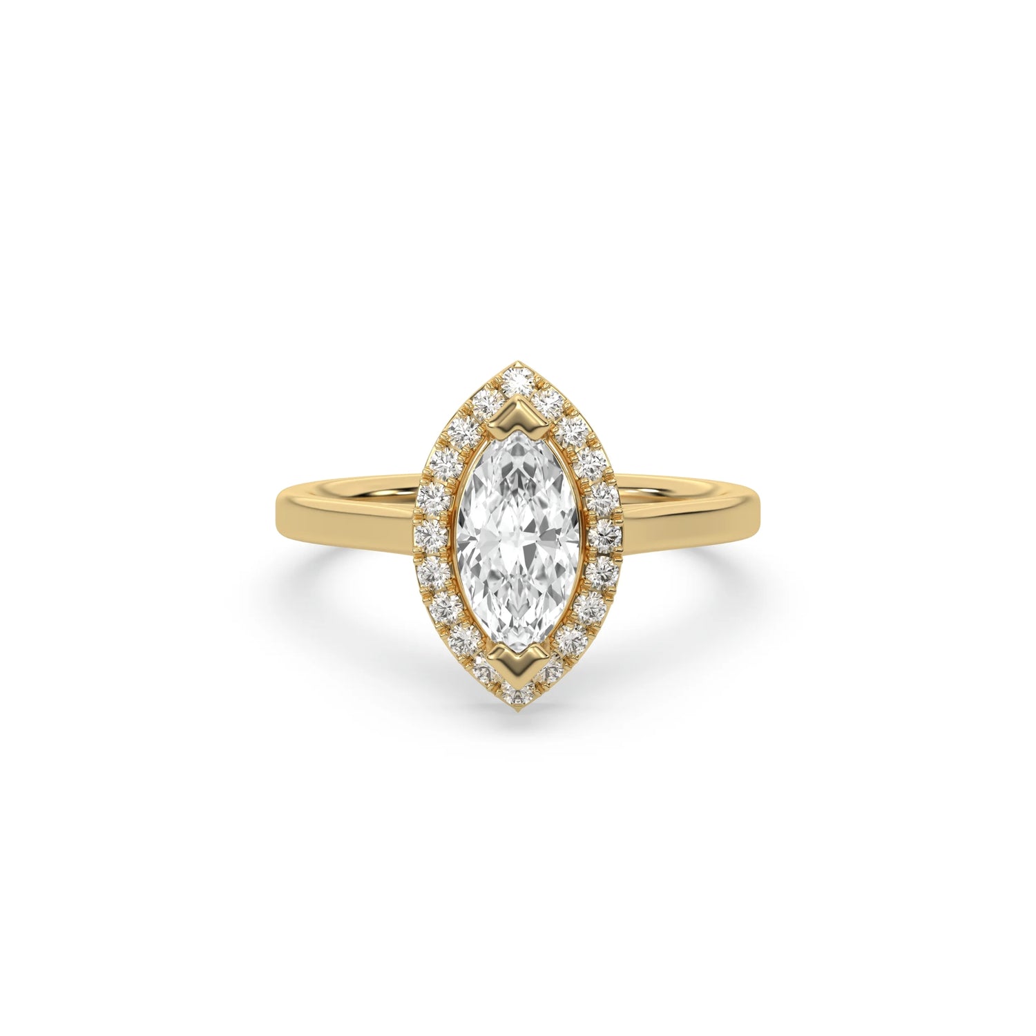 This ring is made with a marquise solitaire diamond set in a two-prong setting, surrounded by a halo of round diamonds, all resting on a delicate gold band.
