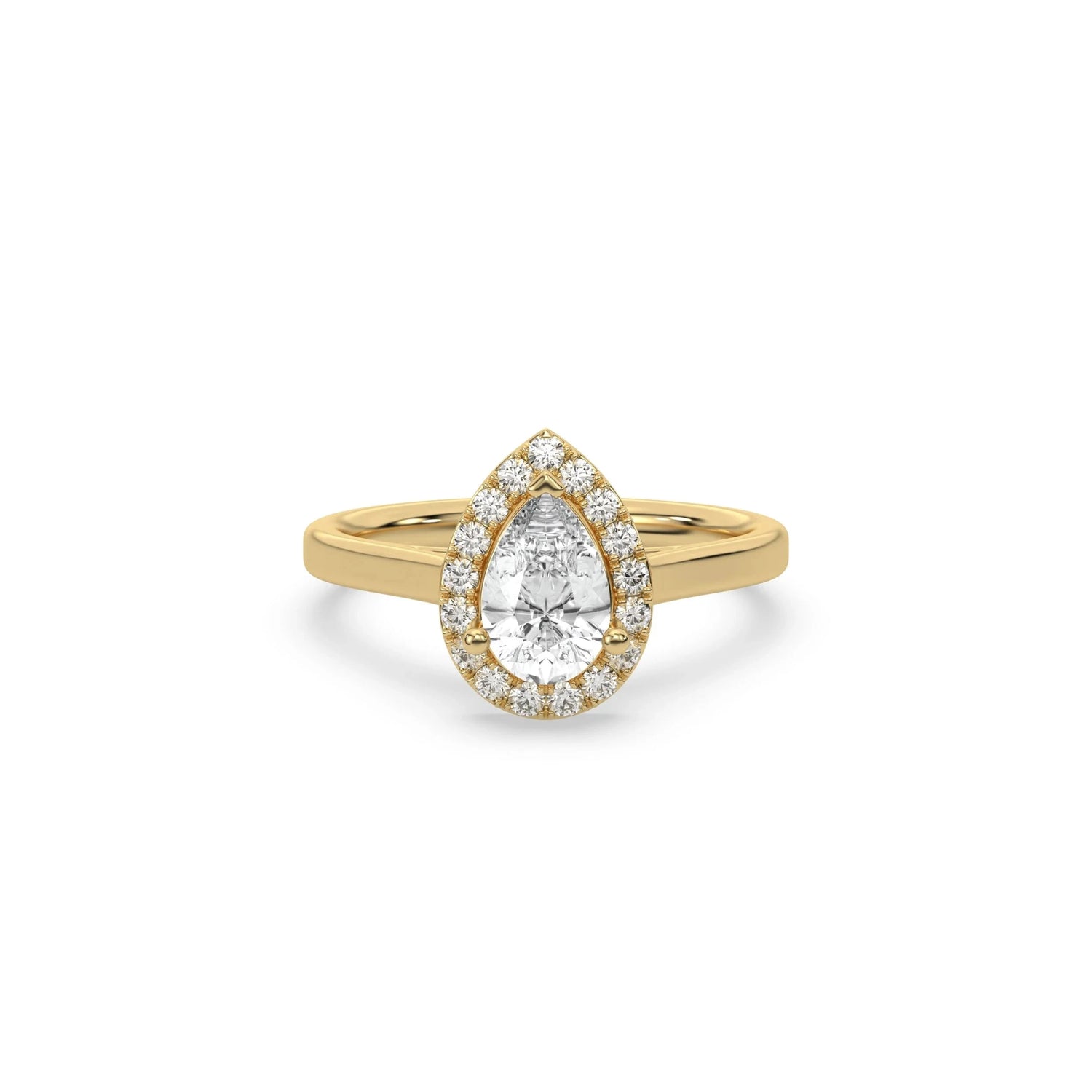 This ring is made with a pear solitaire diamond set in a three-prong setting, surrounded by a halo of round diamonds, all resting on a delicate gold band.