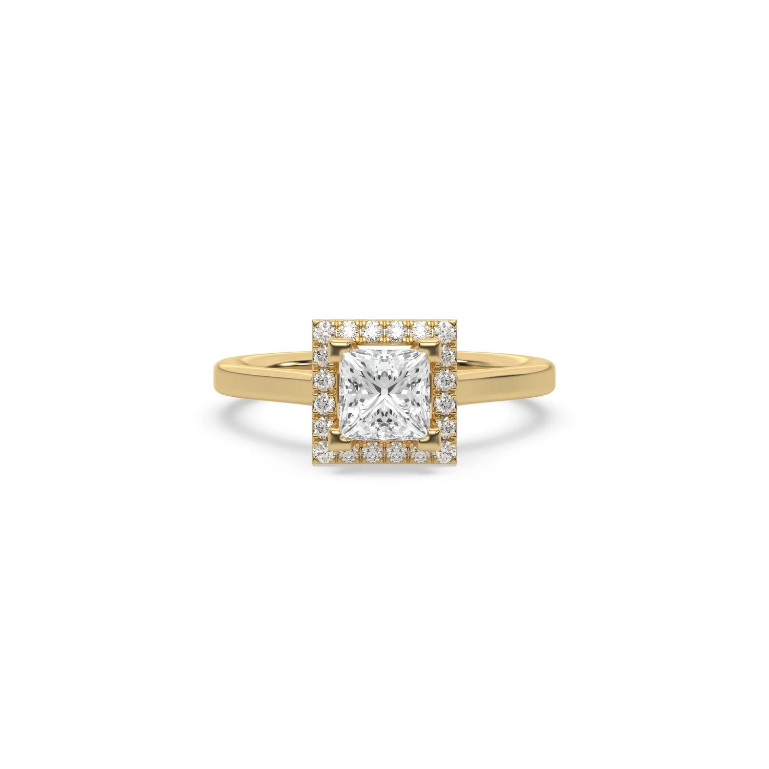This ring is made with a princess solitaire diamond set in a four-prong setting, surrounded by a halo of round diamonds, all resting on a delicate gold band.