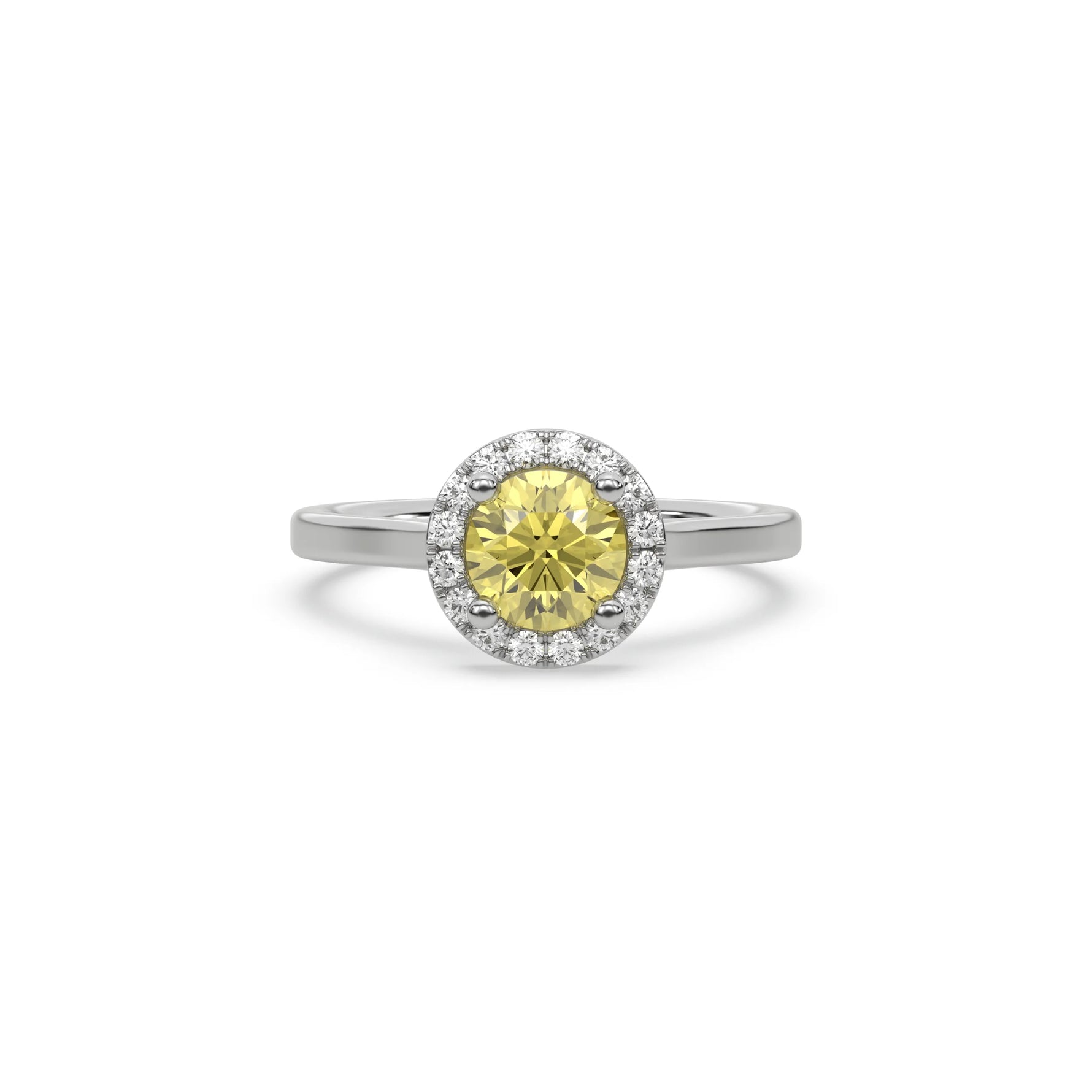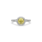 This ring features a fancy yellow round solitaire diamond set in a four-prong setting, surrounded by a halo of round diamonds, all resting on a delicate gold band.