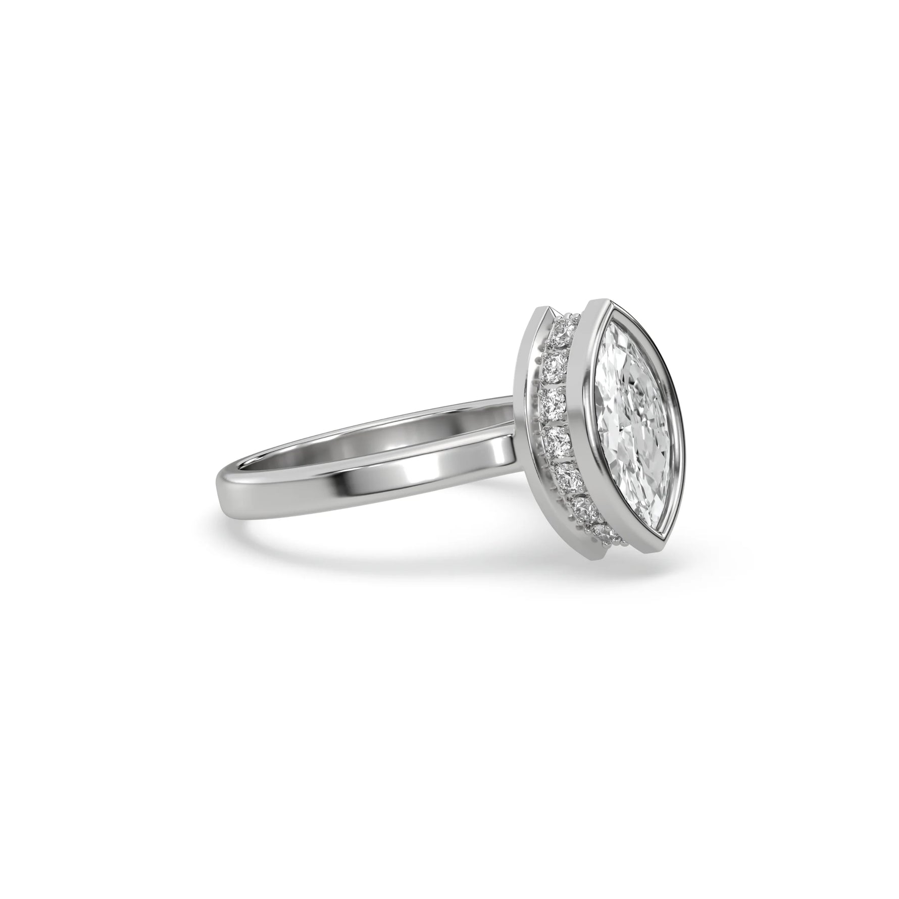 Marquise Diamond Hidden Halo Engagement Ring is made with a marquise cut diamond set in a bezel setting with a hidden-halo of round diamonds all set in a pave setting on a solid gold band.