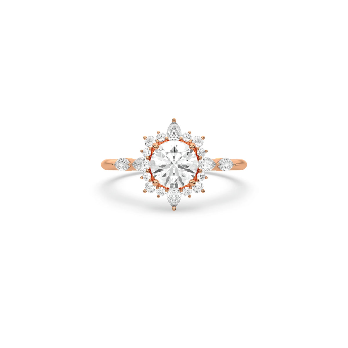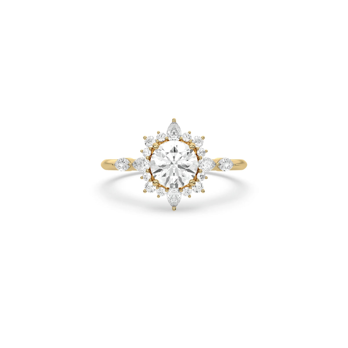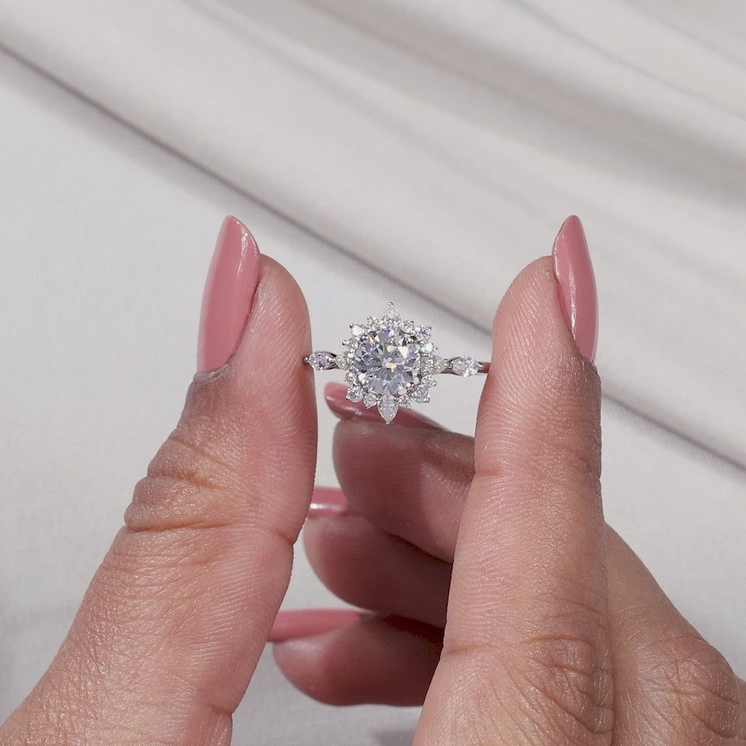 Bring brilliance and elegance to your love story with this stunning Halo Diamond Engagement Ring. At the center sits a round cut diamond in a secure four-prong setting, surrounded by a halo of round and pear-shaped diamonds. The delicate snowflake-inspired halo design makes this piece stand out, creating a look that is both modern and timeless. Perfect as a proposal ring or a romantic halo wedding ring, it’s crafted to celebrate life’s most important moments.