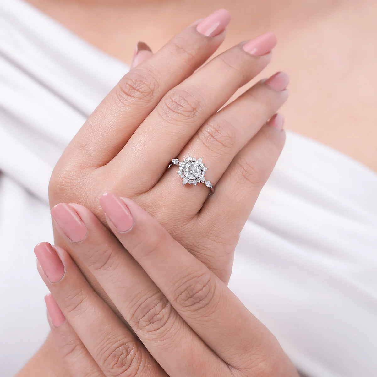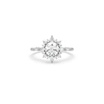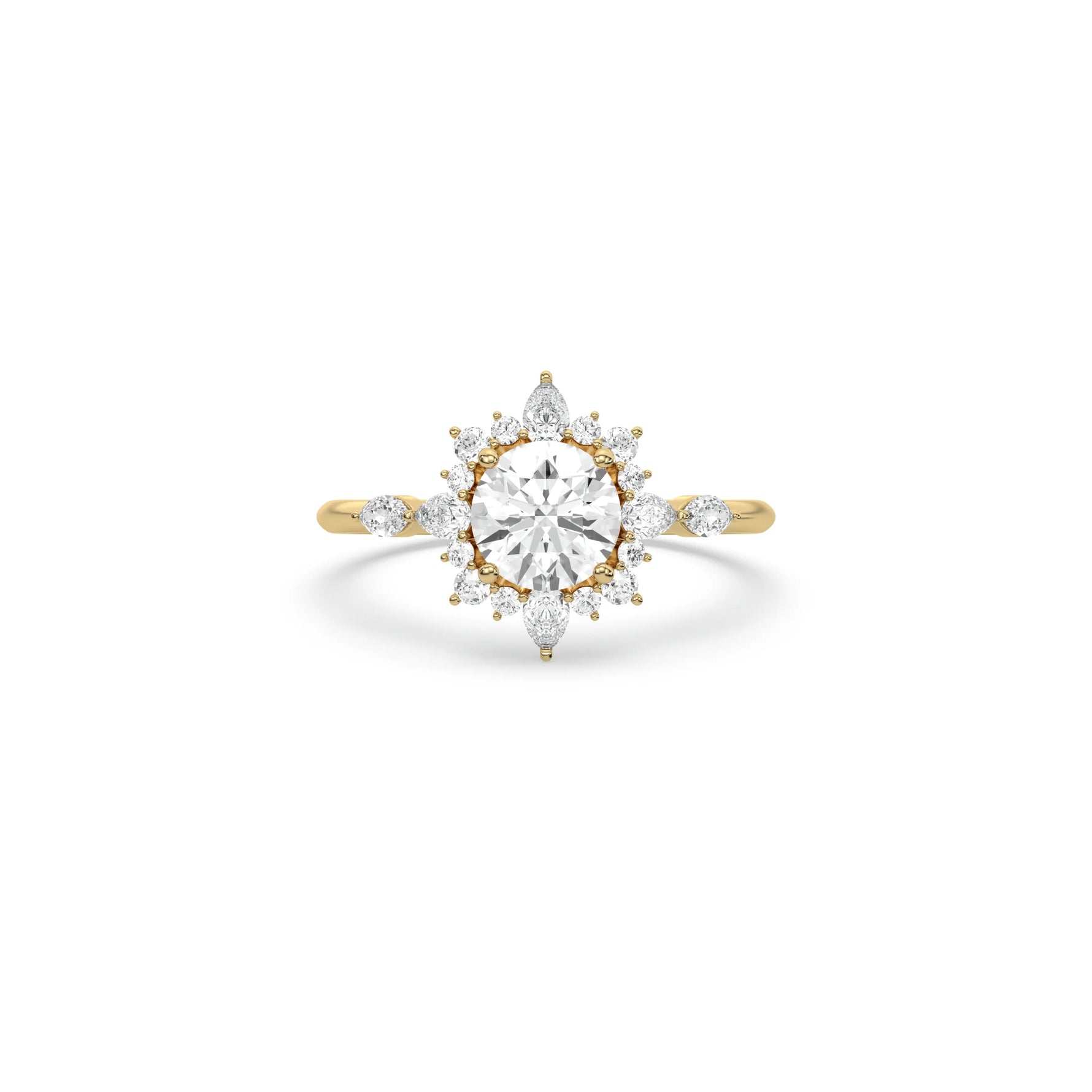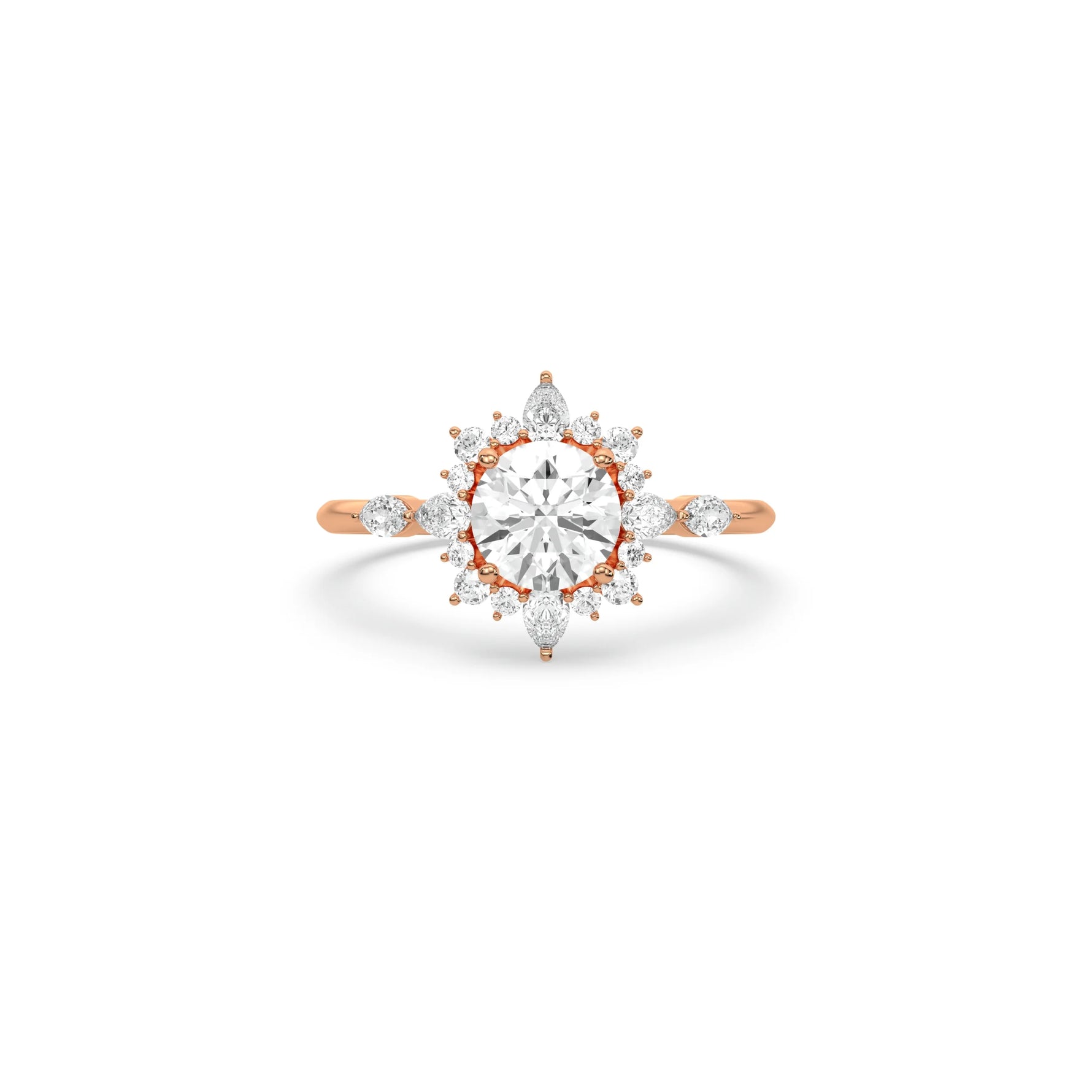 Bring brilliance and elegance to your love story with this stunning Halo Diamond Engagement Ring. At the center sits a round cut diamond in a secure four-prong setting, surrounded by a halo of round and pear-shaped diamonds. The delicate snowflake-inspired halo design makes this piece stand out, creating a look that is both modern and timeless. Perfect as a proposal ring or a romantic halo wedding ring, it’s crafted to celebrate life’s most important moments.
