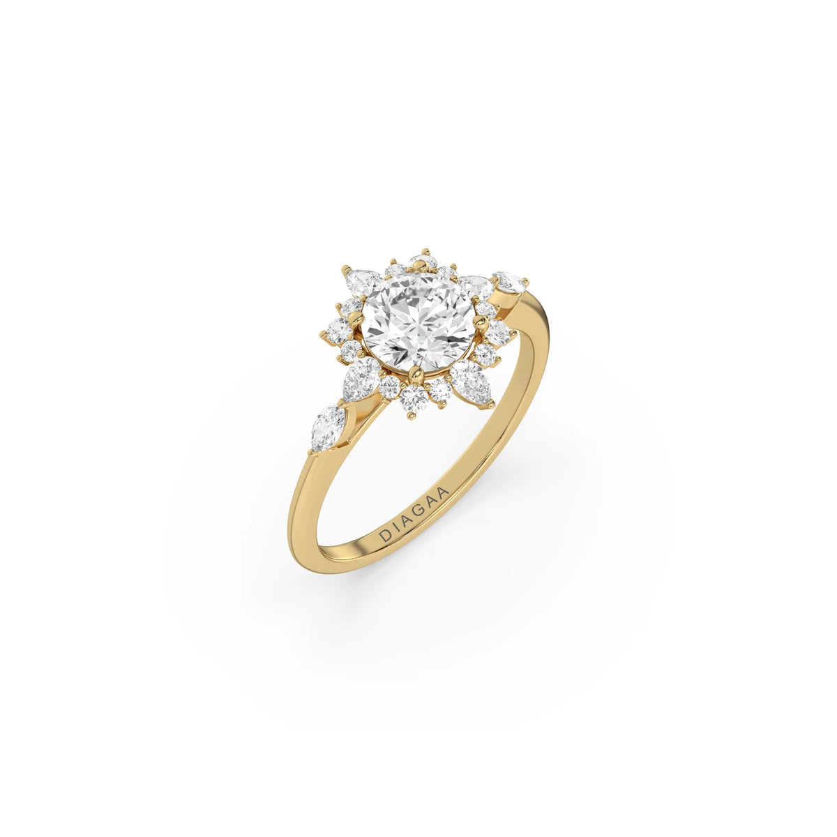 The design continues with two marquise diamonds, one set on each side of the band, adding extra sparkle and balance. The polished gold band provides a classic finish, allowing the center stone and halo to shine even brighter. Whether you prefer natural or lab grown diamond engagement rings, this style captures the best of both beauty and craftsmanship. Each detail is thoughtfully designed to enhance the brilliance of the diamond and to create a ring that feels as special as the love it represents.