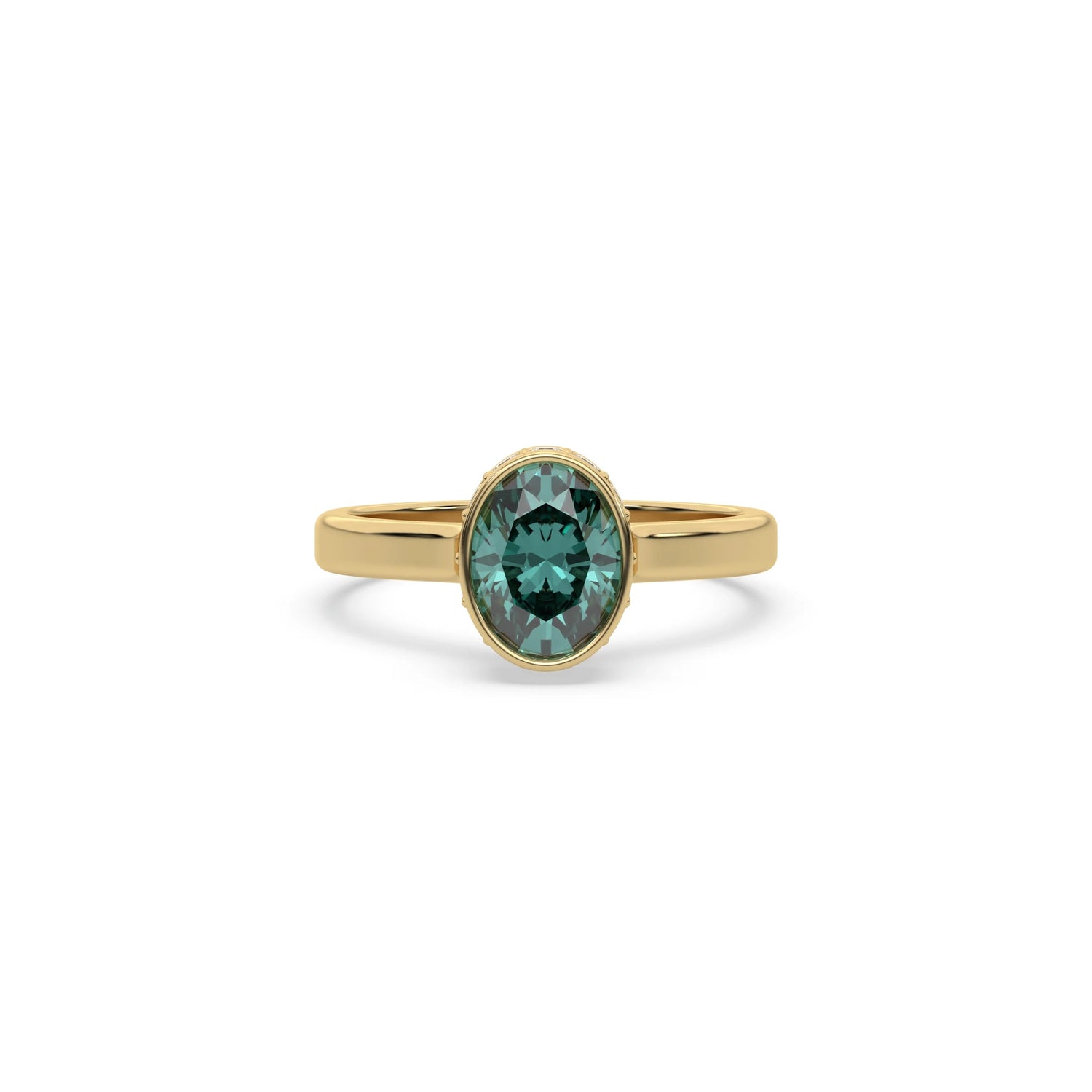 Fancy Green Oval Diamond Hidden Halo Engagement Ring is made with an fancy Green oval diamond, set in a bezel setting with a hidden-halo of round diamonds all set in a pave setting on a solid gold band.