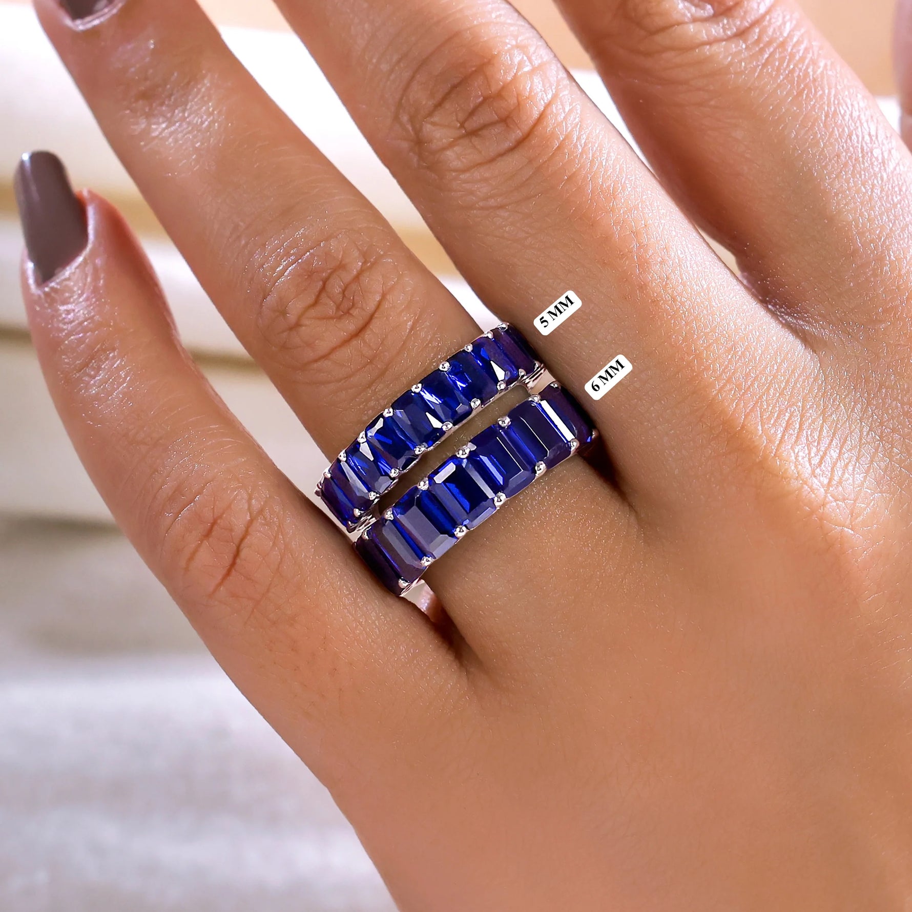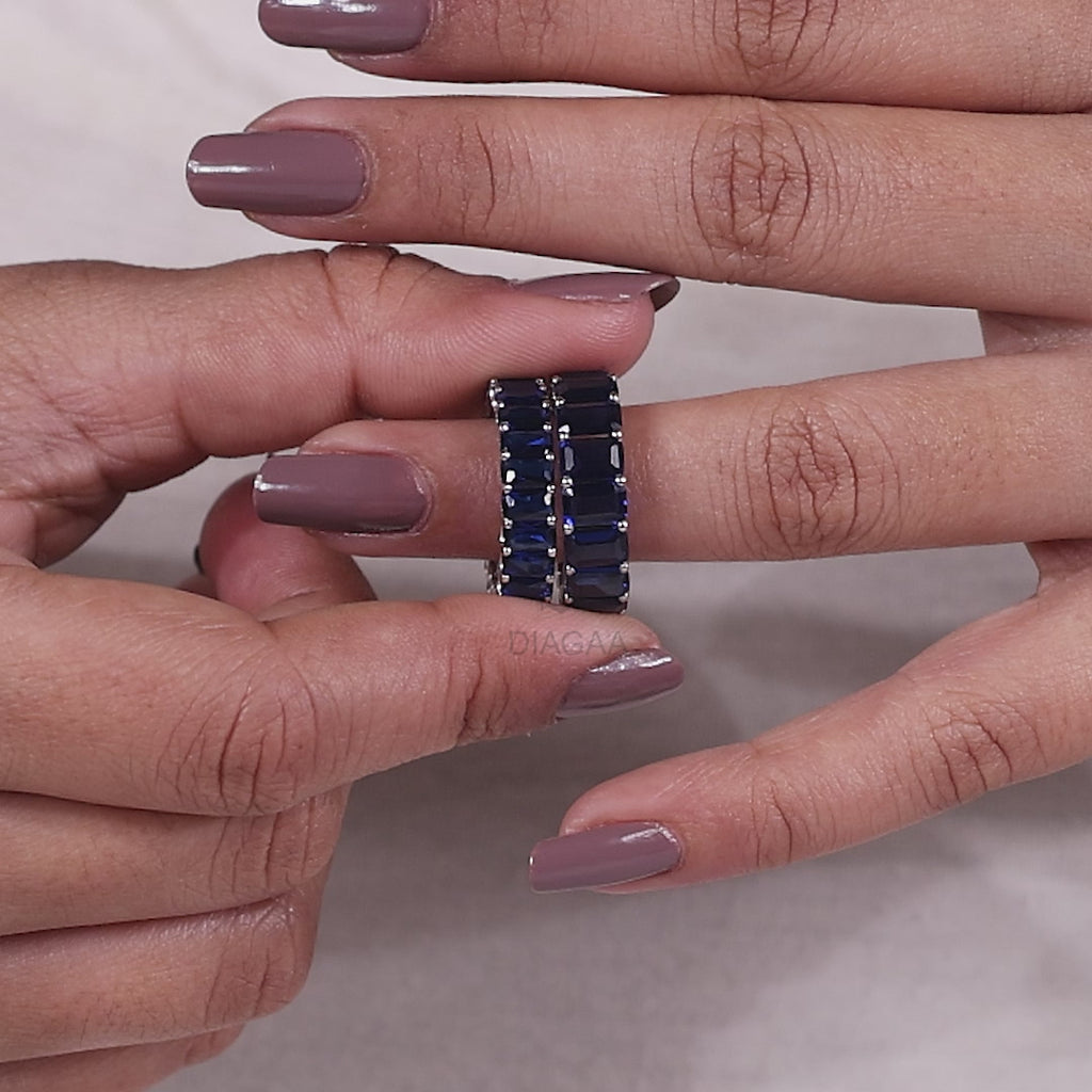 This 6 mm full eternity band features approximately 8.00 carats of Emerald cut lab created blue sapphire gemstones set in prong setting.