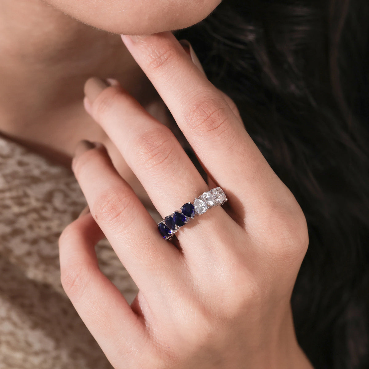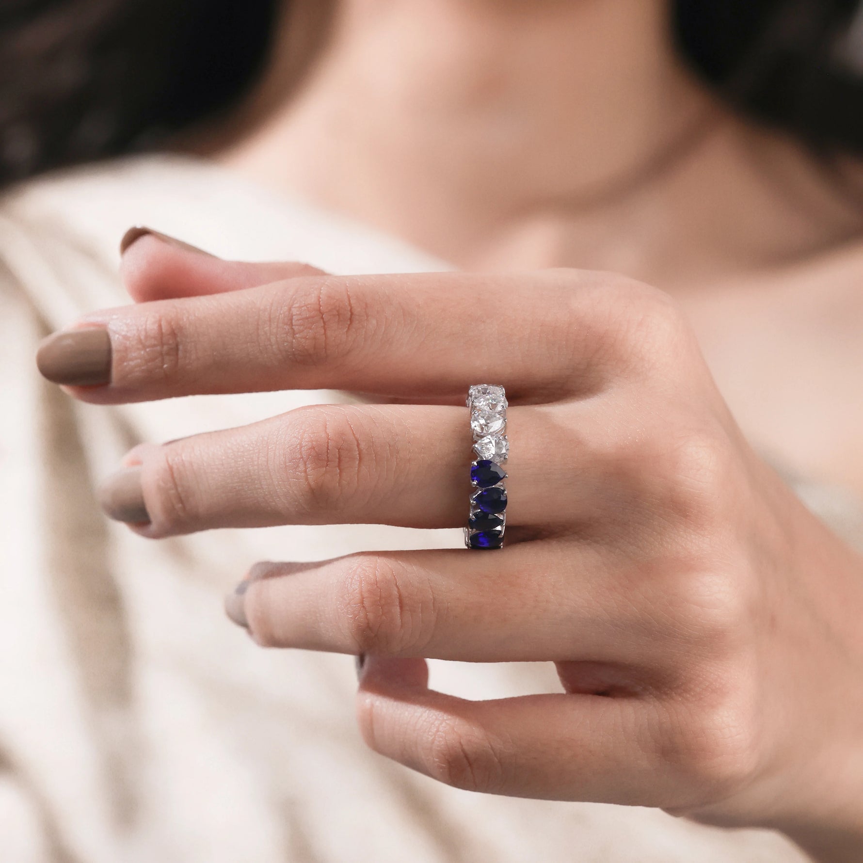3.40 CT Pear Shaped Lab Diamond and Blue Sapphire Eternity Ring
