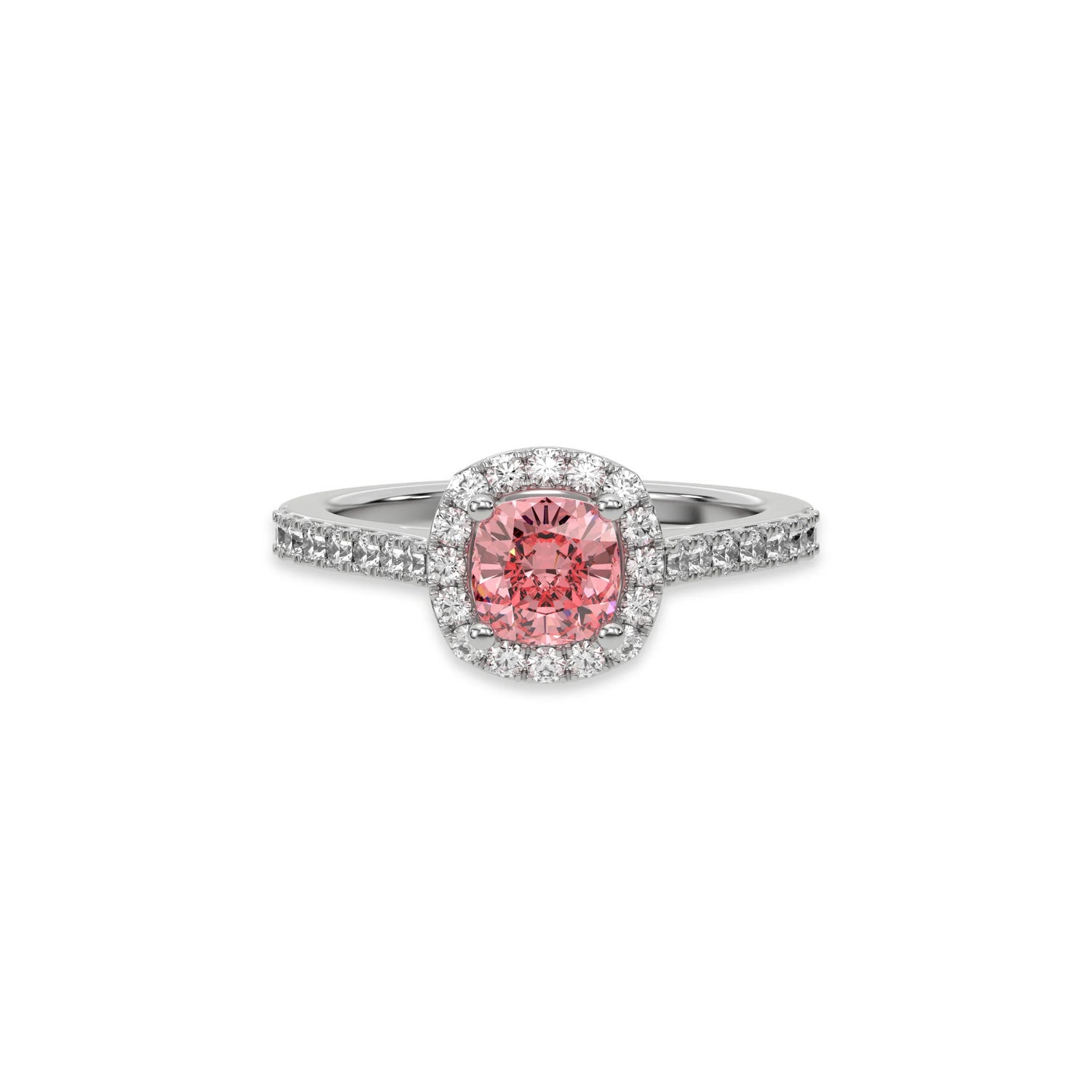 Fancy Pink Cushion Diamond Halo Engagement Ring is made with a fancy Pink cushion solitaire diamond set in a four-prong setting, surrounded by a halo of round diamonds all set on a pave band with round cut diamonds.