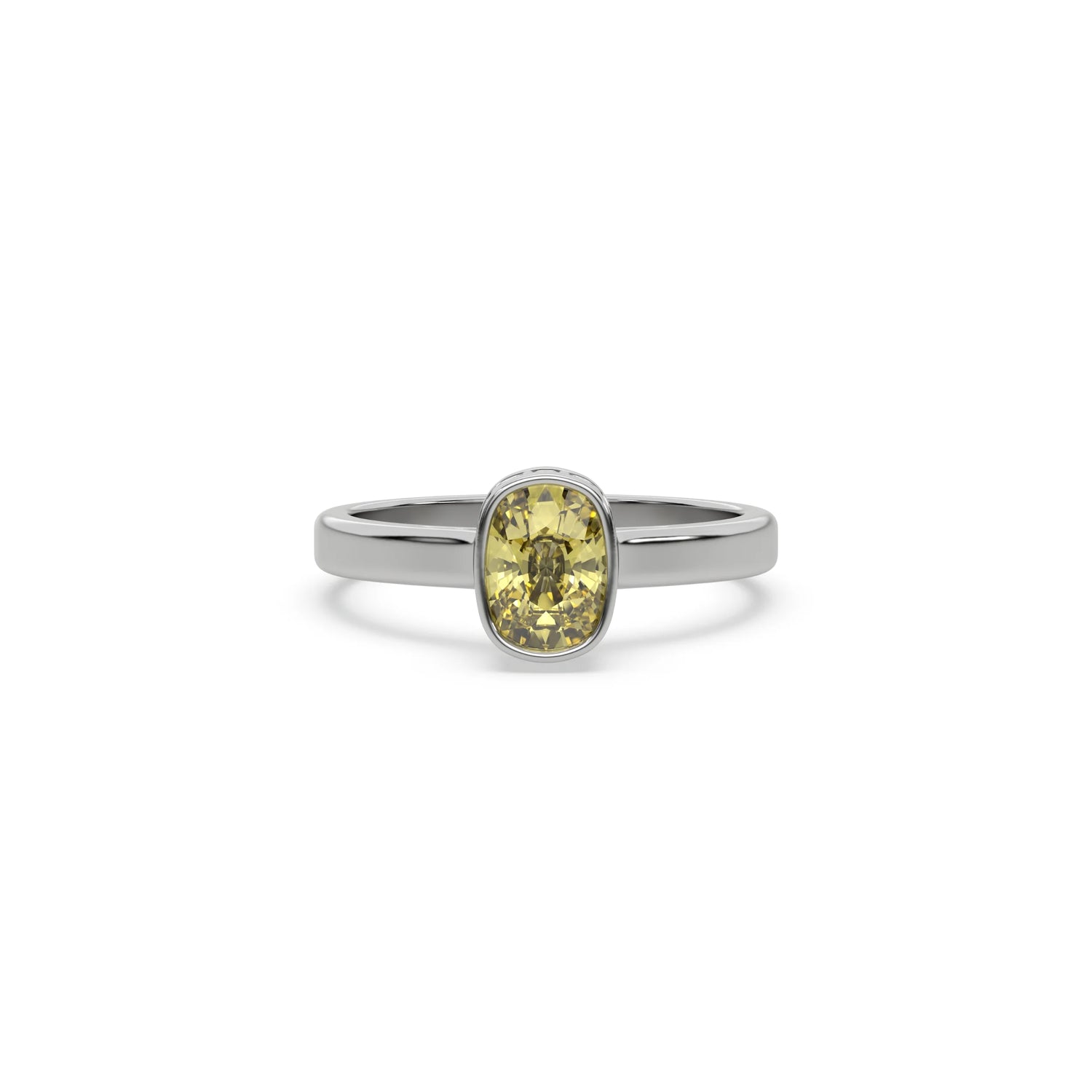 Fancy Yellow Cushion Diamond Bezel Engagement Ring is made with a fancy yellow cushion cut diamond, set in a bezel setting on a solid gold band.