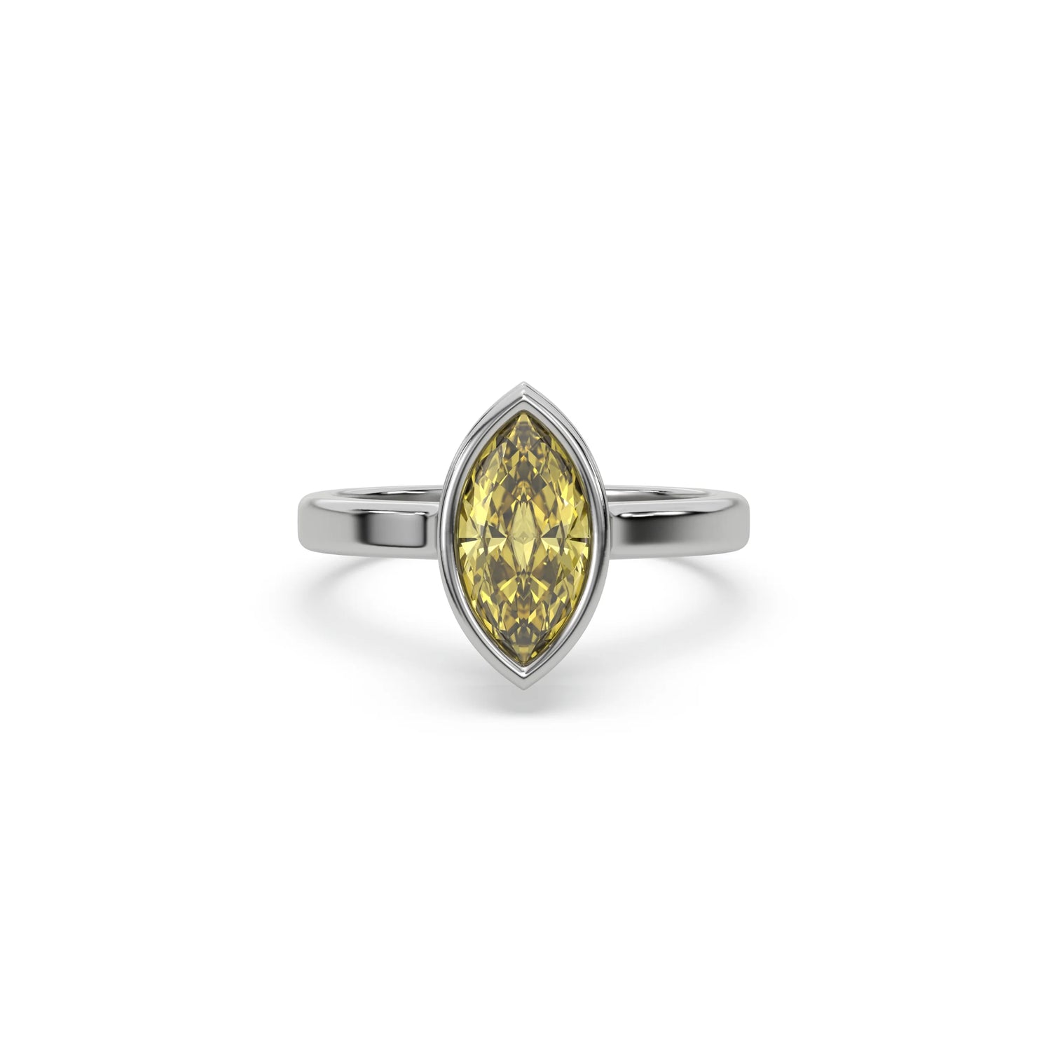 Fancy Yellow Marquise Diamond Bezel Engagement Ring is made with a fancy yellow marquise cut diamond set in a bezel setting on a solid gold band.