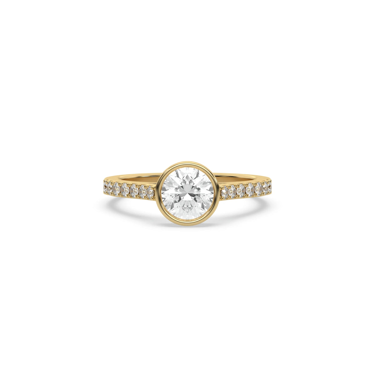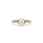 Round Diamond Bezel Engagement Ring is made with a round brilliant cut diamond set in a bezel setting on a pave diamond band made with round brilliant cut diamonds.