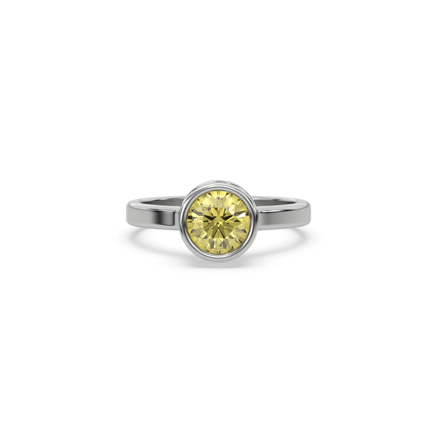 Fancy Yellow Round Diamond Bezel Engagement Ring is made with a fancy yellow round brilliant cut diamond set in a bezel setting on a solid gold band.