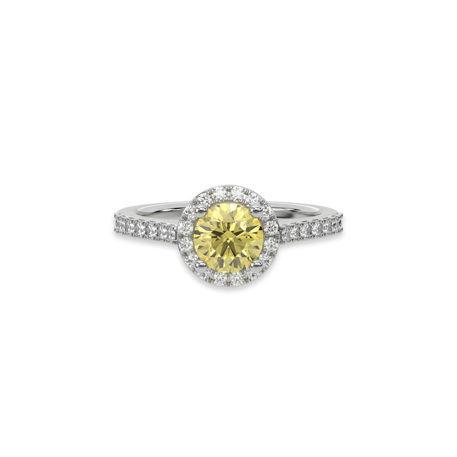 Fancy Yellow Round Diamond Halo Engagement Ring is made with a fancy yellow round solitaire diamond set in a four-prong setting, surrounded by a halo of round diamonds all set on a pave band with round cut diamonds.