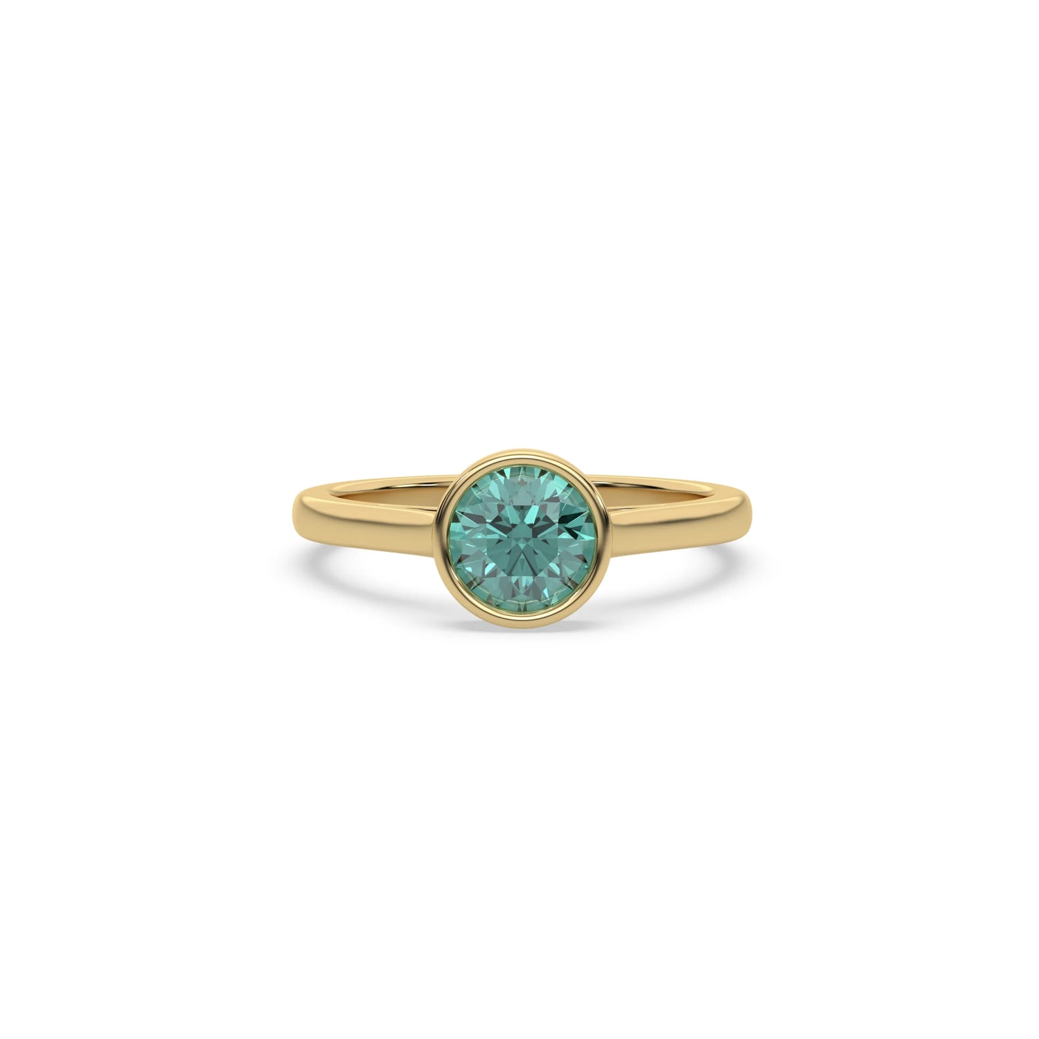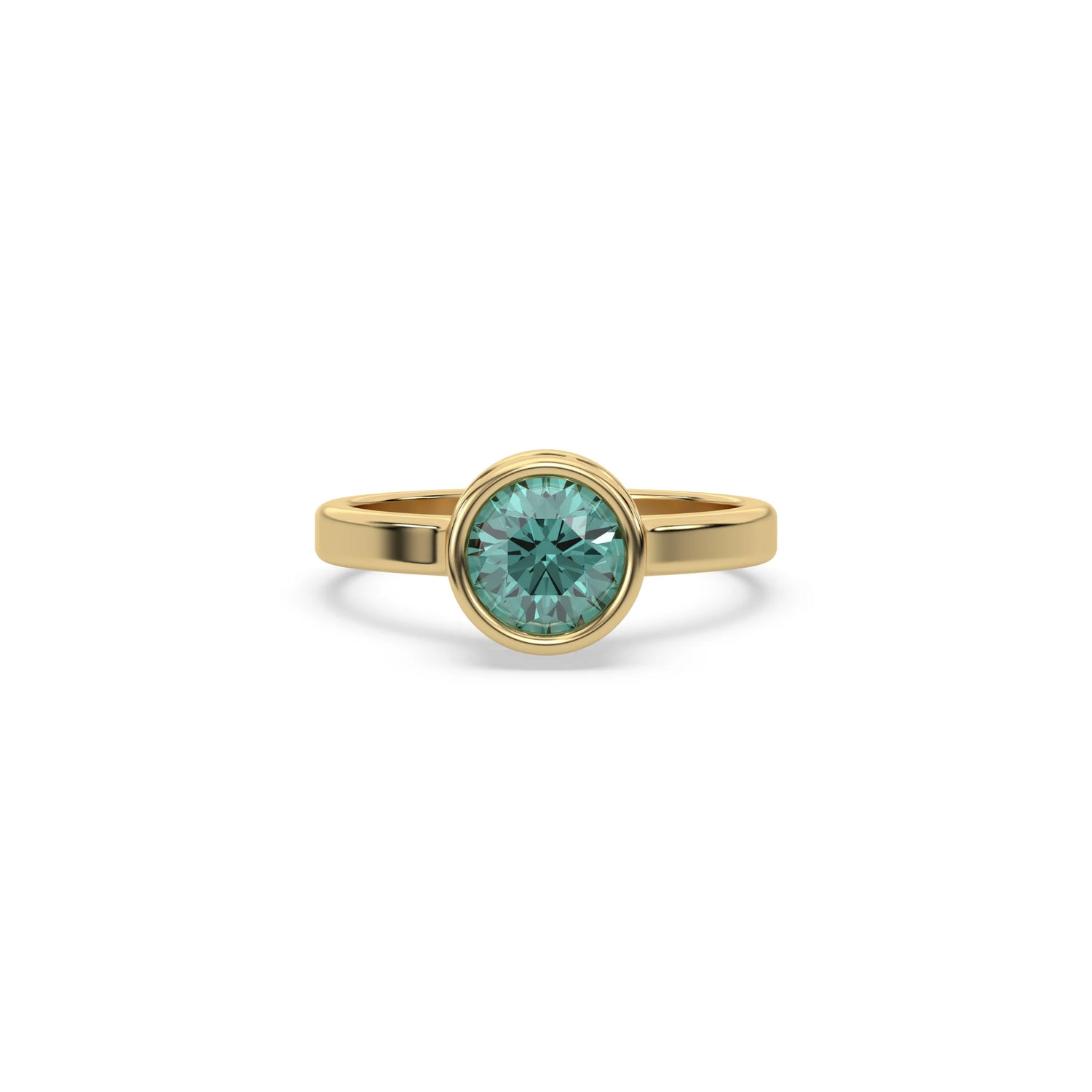Fancy Green Round Diamond Bezel Engagement Ring is made with a fancy Green round brilliant cut diamond set in a bezel setting on a solid gold band.