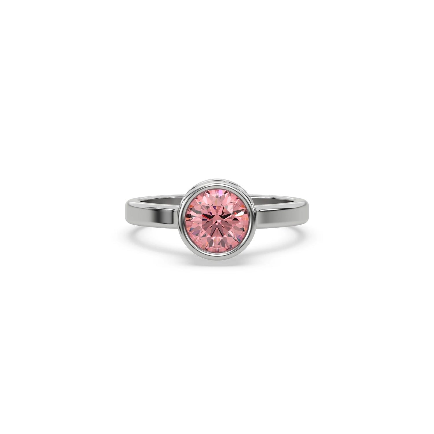 Fancy Pink Round Diamond Bezel Engagement Ring is made with a fancy Pink round brilliant cut diamond set in a bezel setting on a solid gold band.
