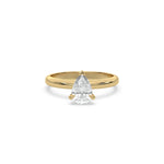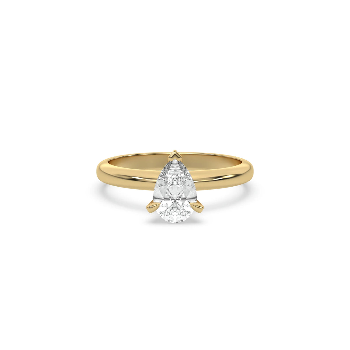 This ring features a pear solitaire diamond elegantly secured in a three-prong setting on a solid gold band for a classic and timeless look.