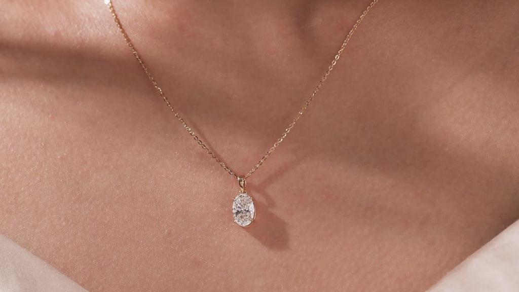 A solitaire necklace featuring an oval diamond securely set in four prongs for a simple yet stunning look.