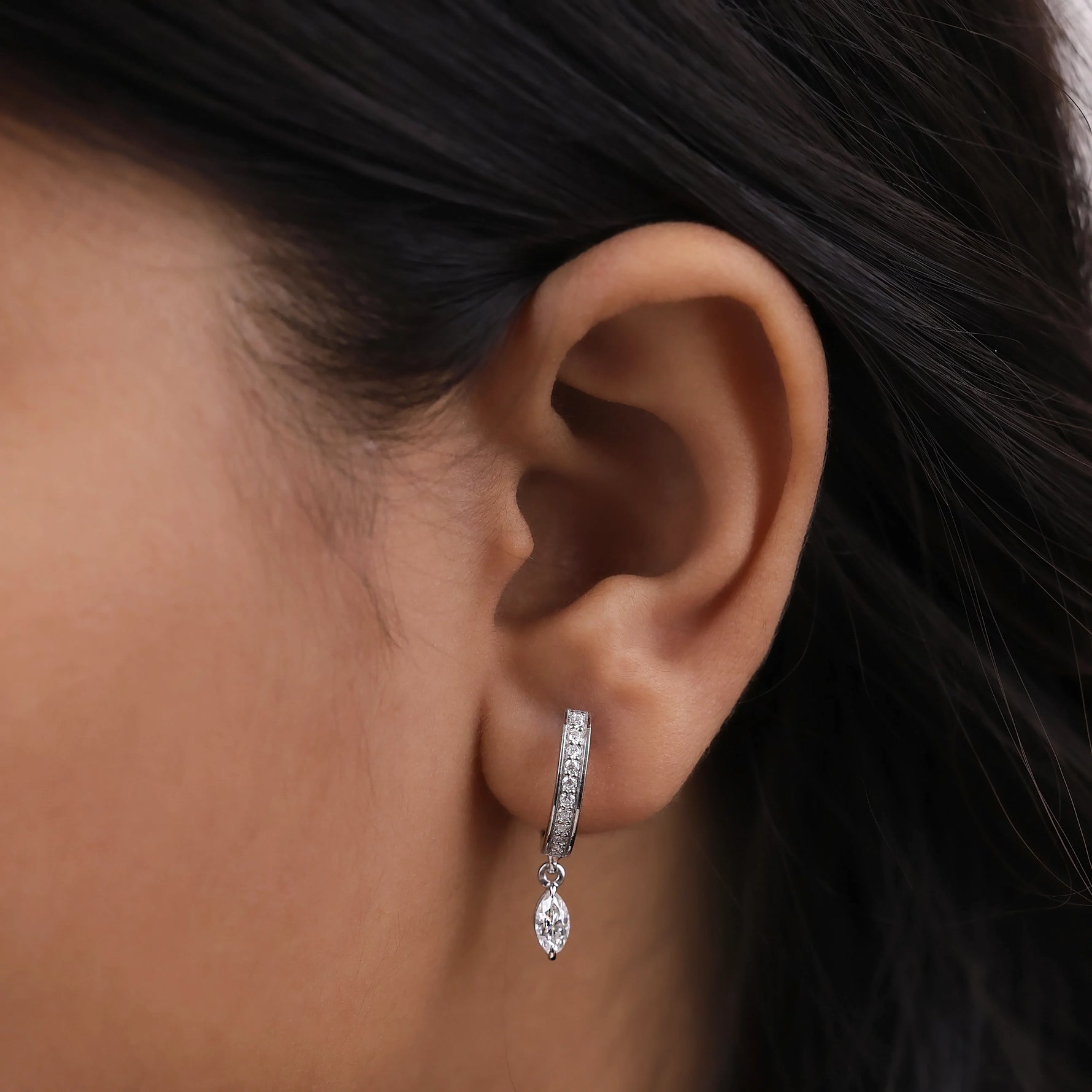10k white gold natural dangling marquise diamond hoop earrings with round brilliant cut diamonds in pave setting in hoop and a marquise solitaire hanging at the bottom.