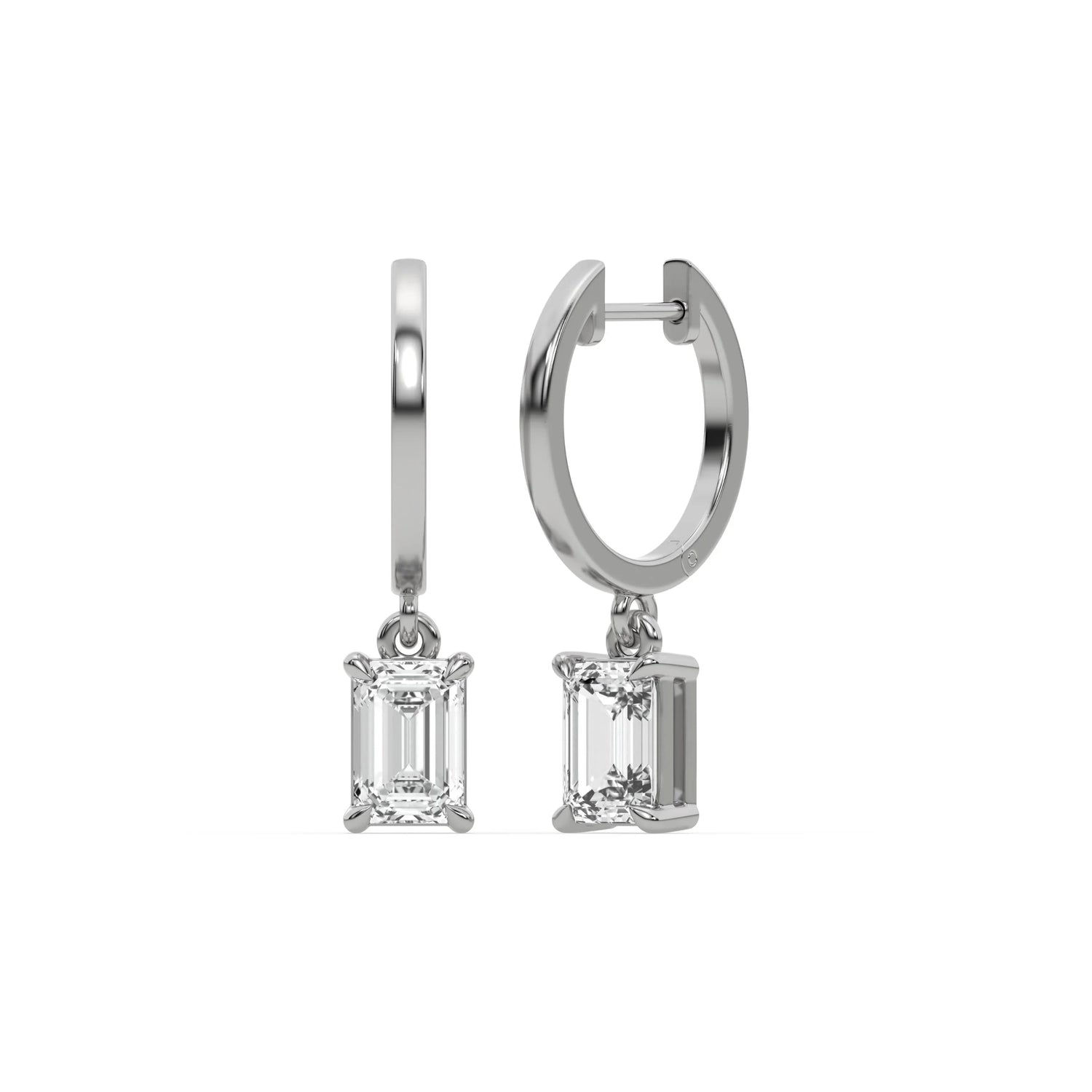 Gold hoop earrings features a dangling emerald diamond on each hoop, securely set in a prong setting.