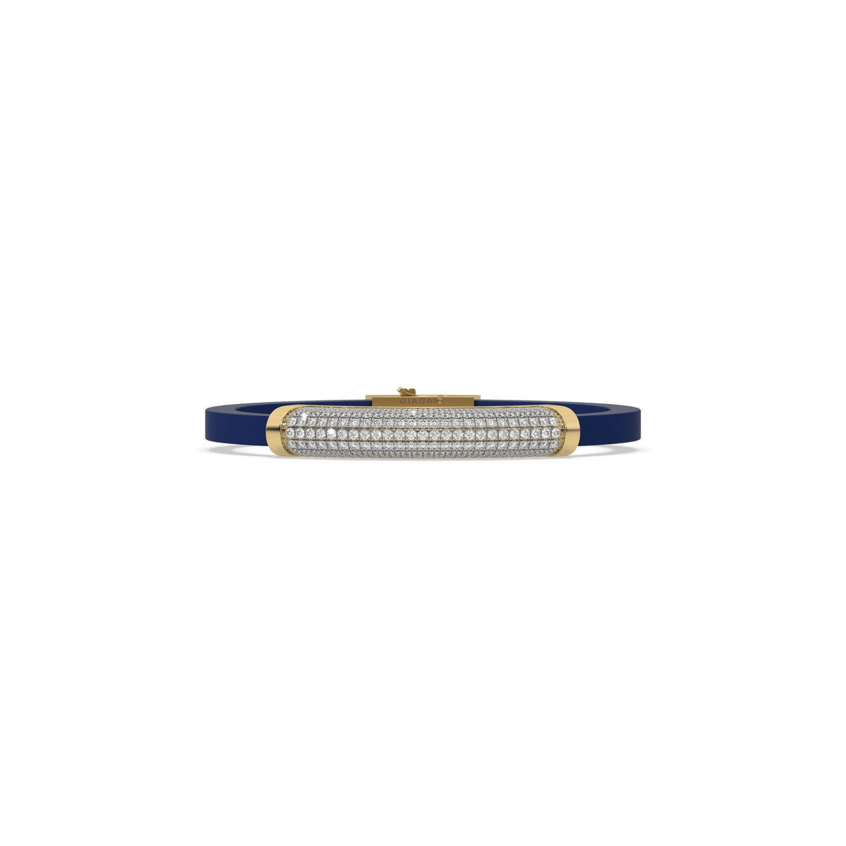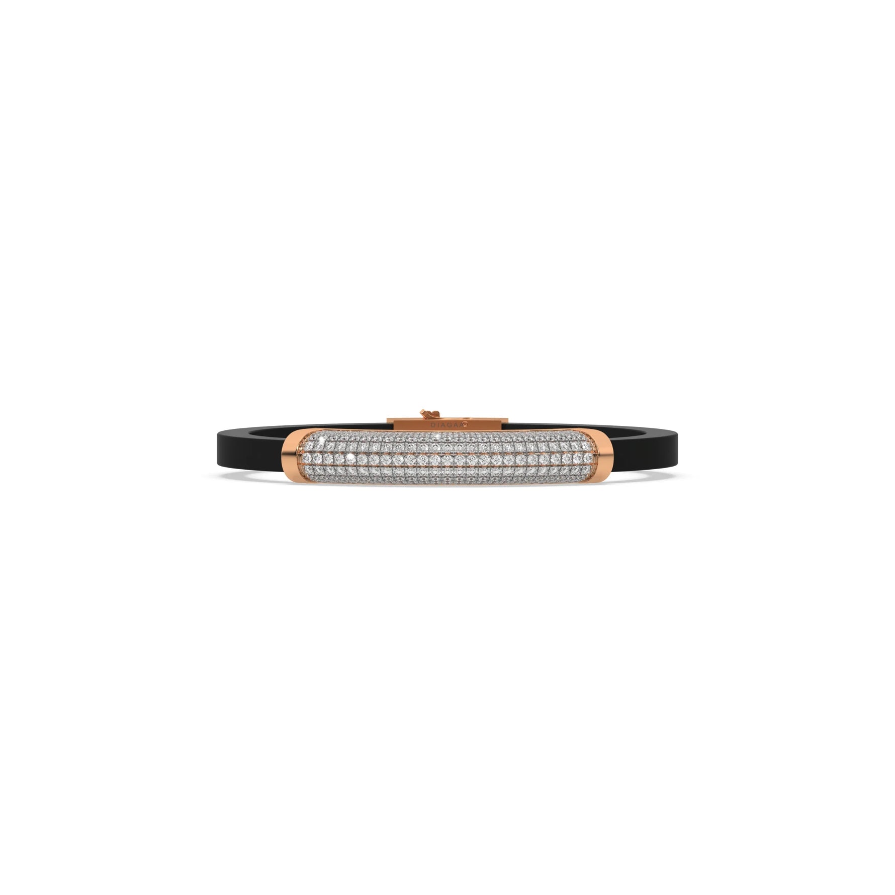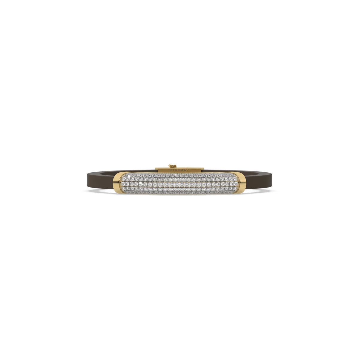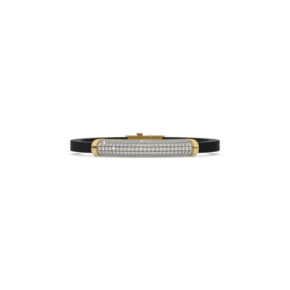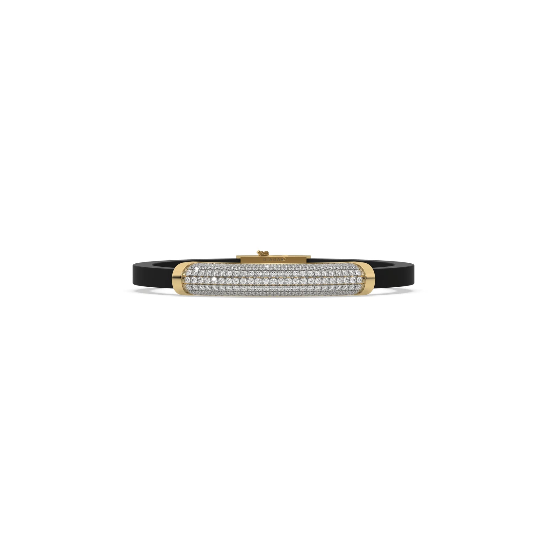 Curved diamond rubber bracelet features 3.90 CT of round cut diamonds set in a prong setting. Personalize your bracelet by choosing your preferred rubber color (black, brown, or blue) and gold type, available in either 14K or 18K gold.