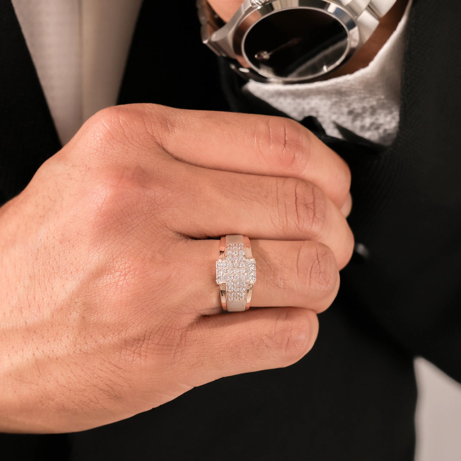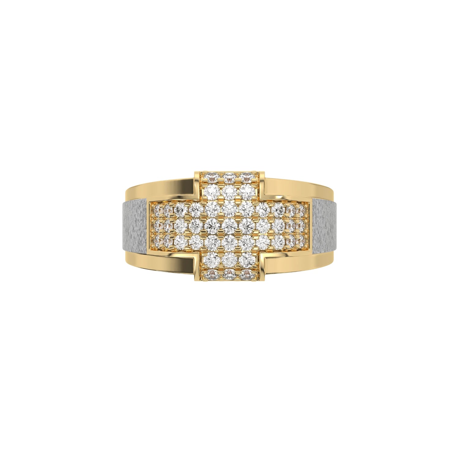 Men's cross diamond ring made with round brilliant-cut diamonds set in a shared prong setting creating a beautiful cross design. The shank features a two-tone band with a combination of matte and glossy finish.