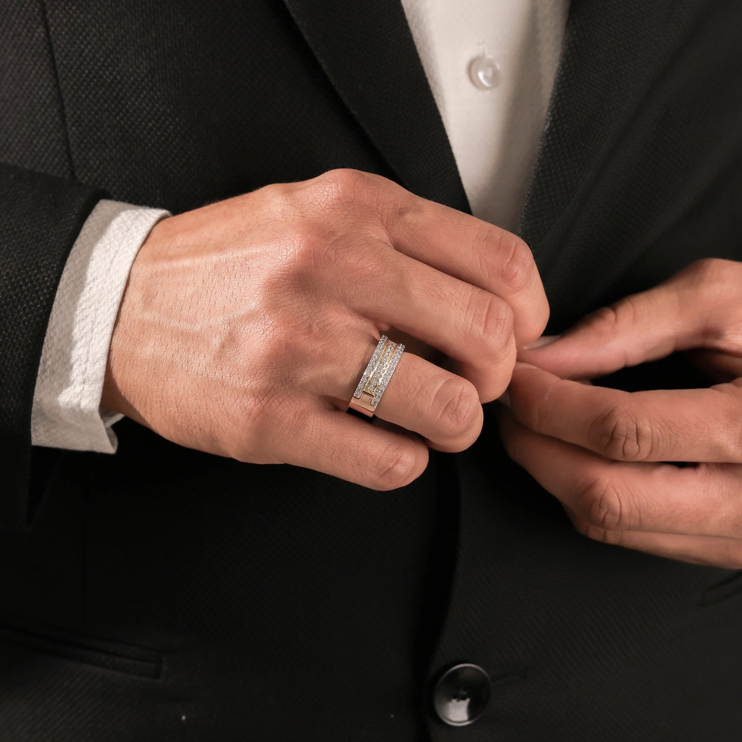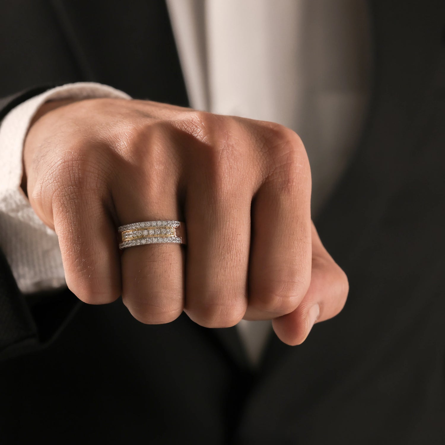 Men's Tres diamond ring, a stunning piece made with three rows of round brilliant-cut diamonds and set in a shared prong setting. The center line of diamond is surrounded by a rectangular metal rim.