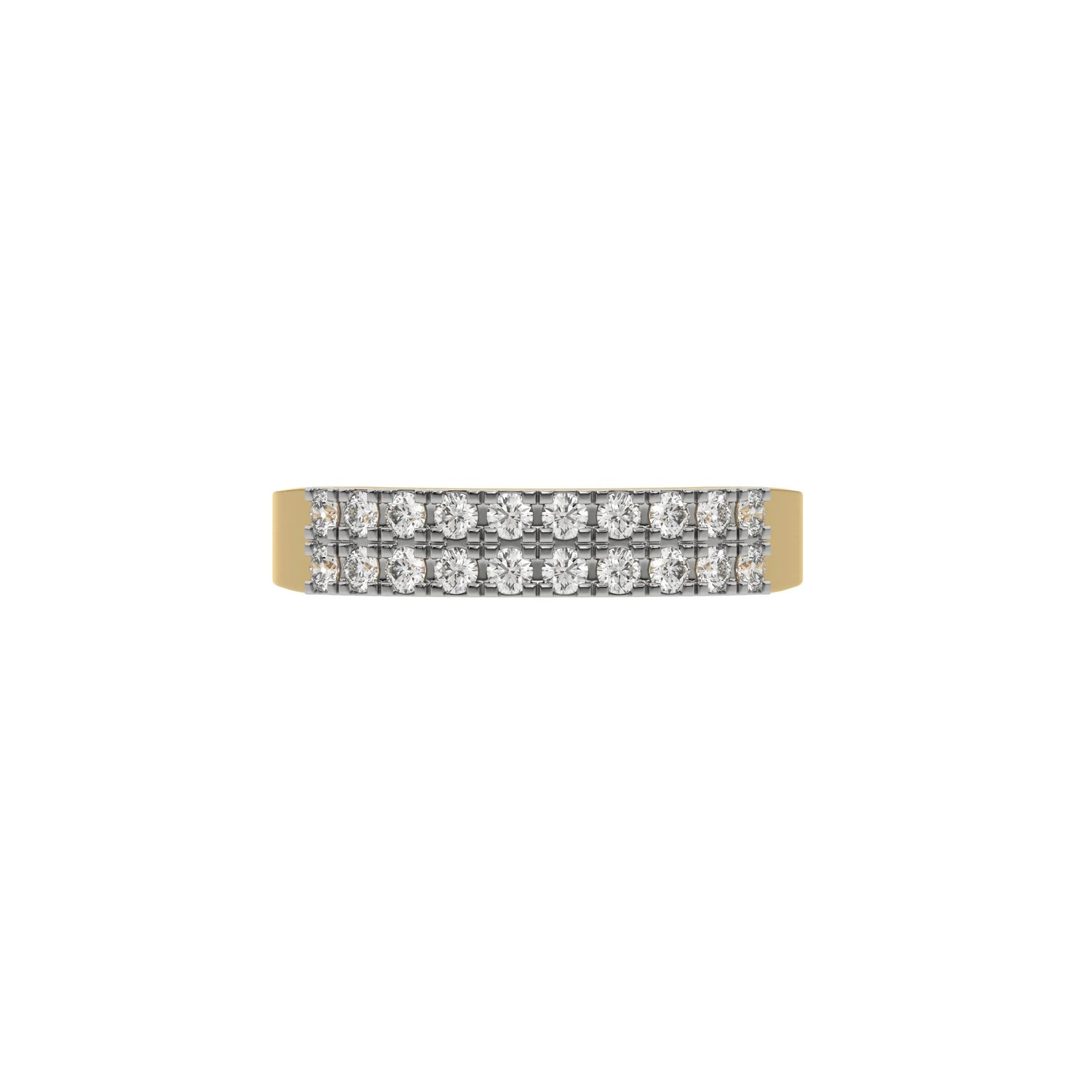 Introducing our two-row diamond ring, featuring a solid gold band with two rows of round brilliant-cut diamonds elegantly set in a secure prong setting.
