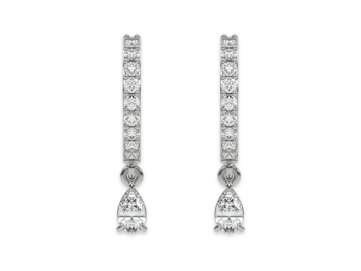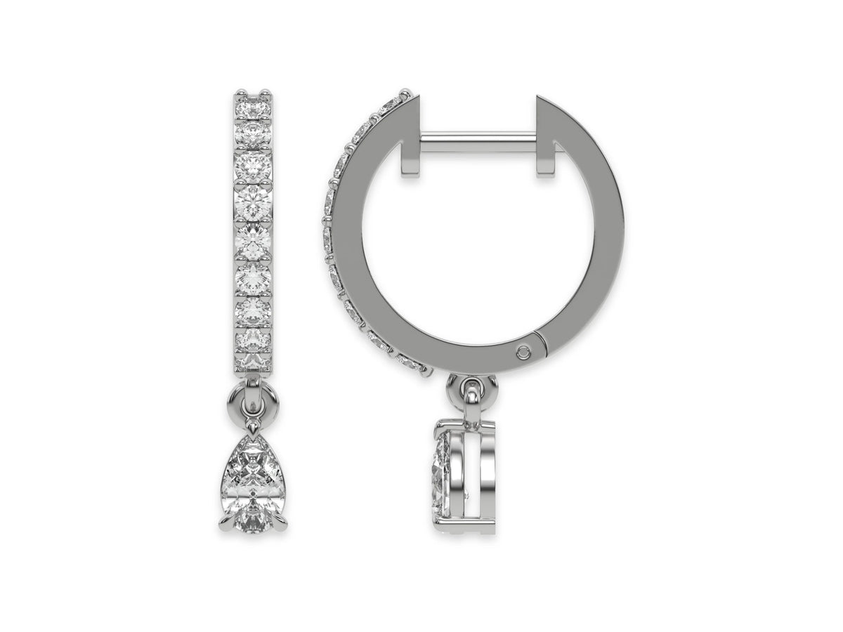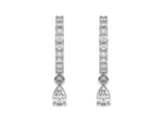 18k white gold dangling pear diamond hoop earrings with a round cut diamond in prong setting.