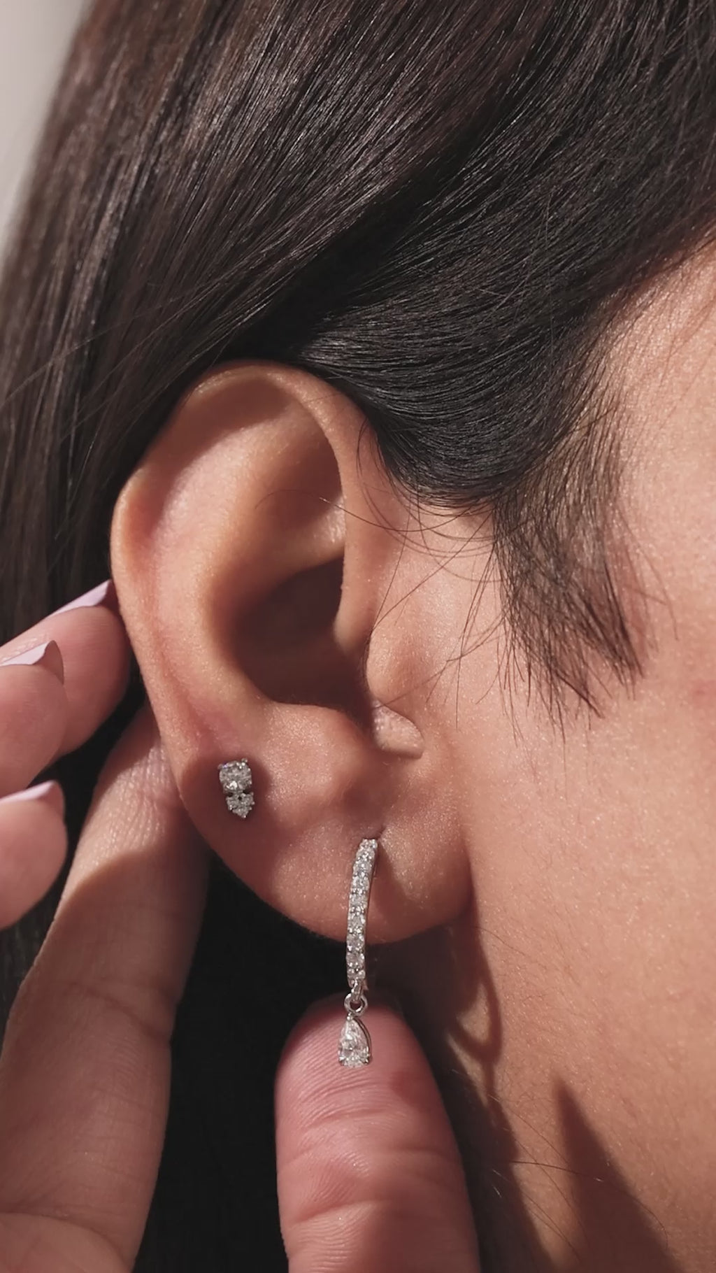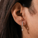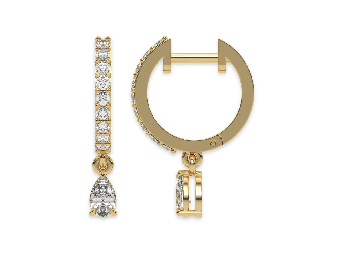 Dangling Pear Diamond Hoop Earrings handmade with round brilliant-cut diamonds in prong setting and a pear solitaire hanging at the bottom.Β