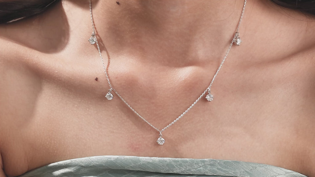 Round Dangling Diamond Necklace made with five round brilliant-cut diamond set in a prong setting, distributed evenly along the chain.