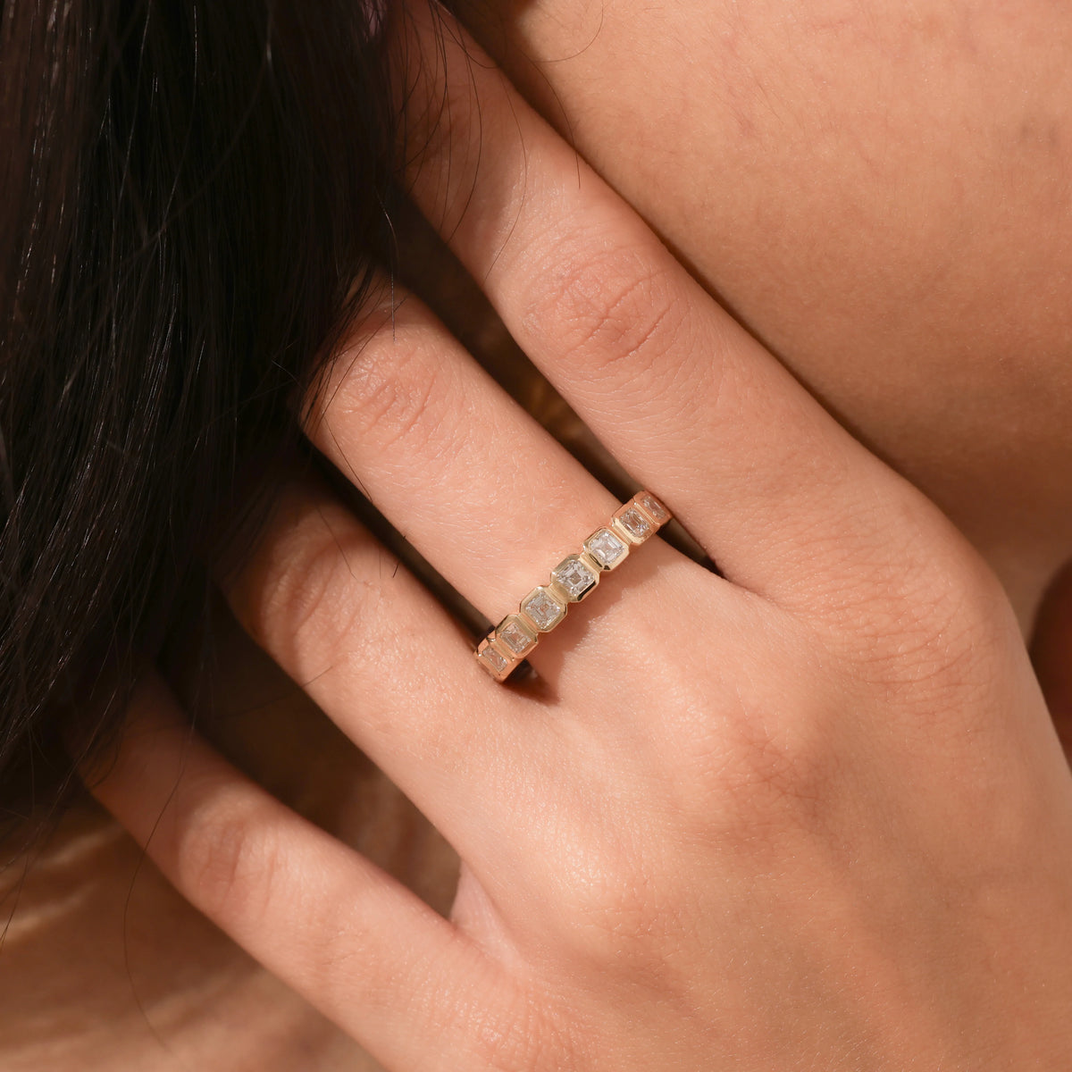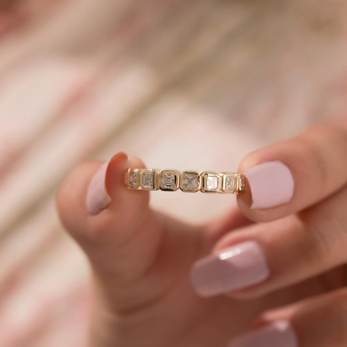 This 3 mm full eternity band features approximately 2.90 carats of asscher natural diamonds set in bezel setting.