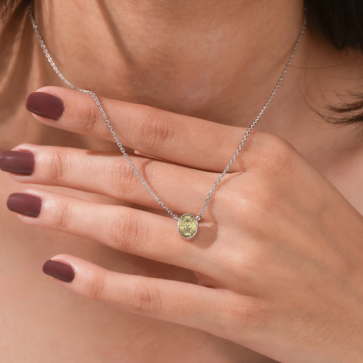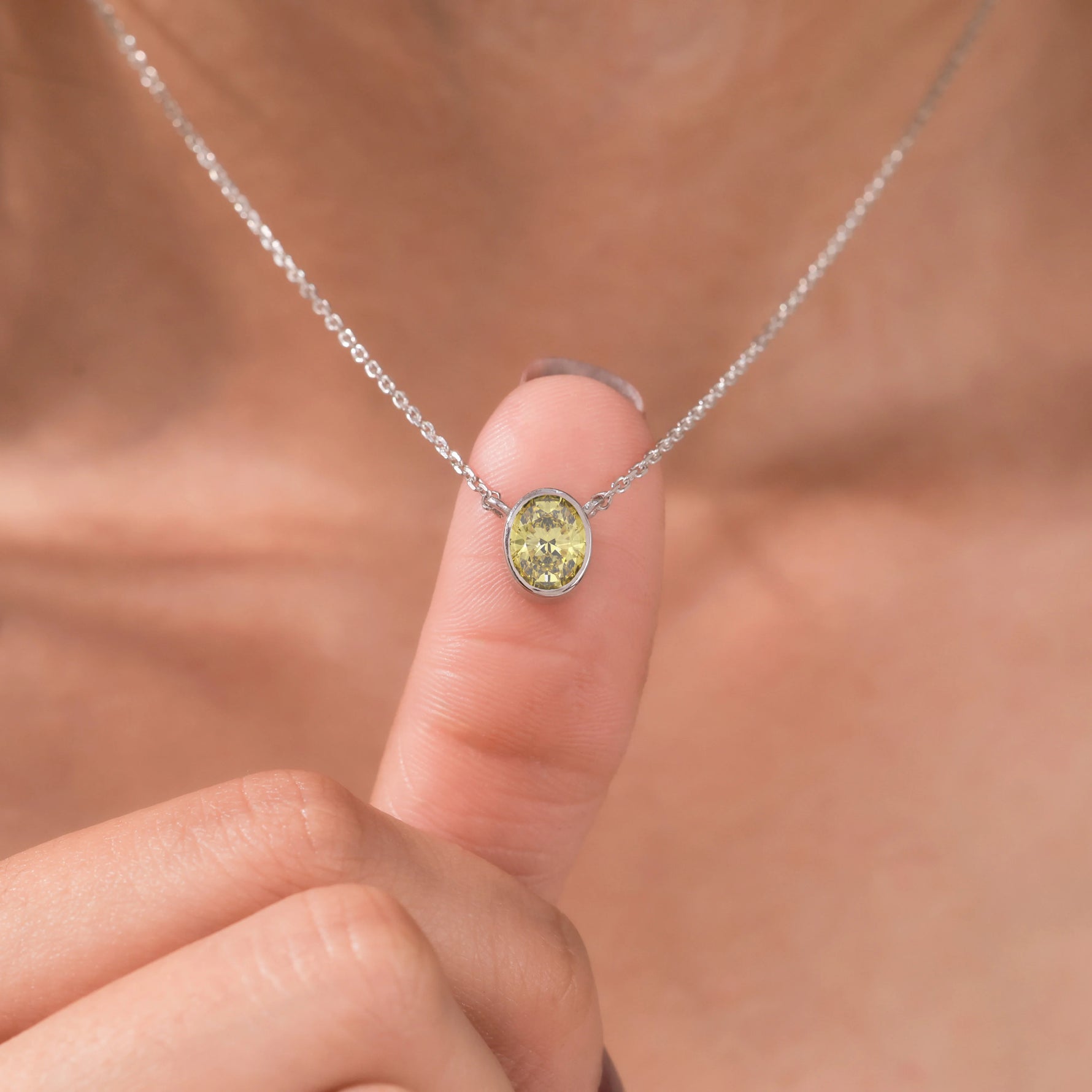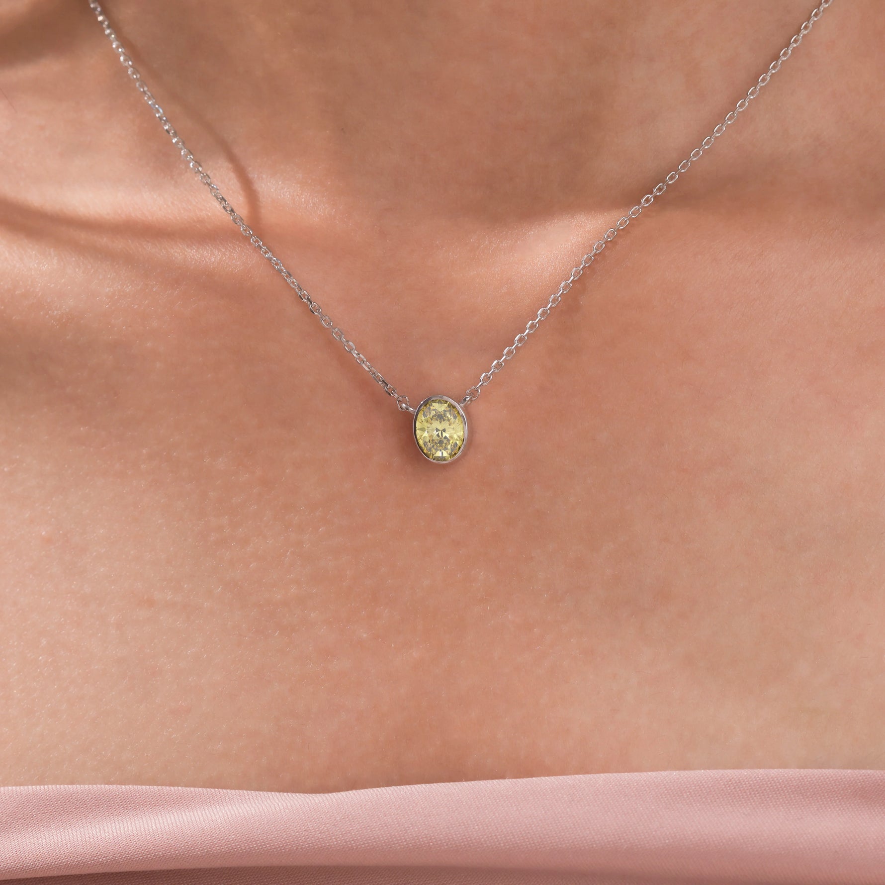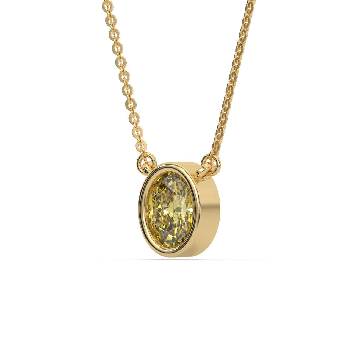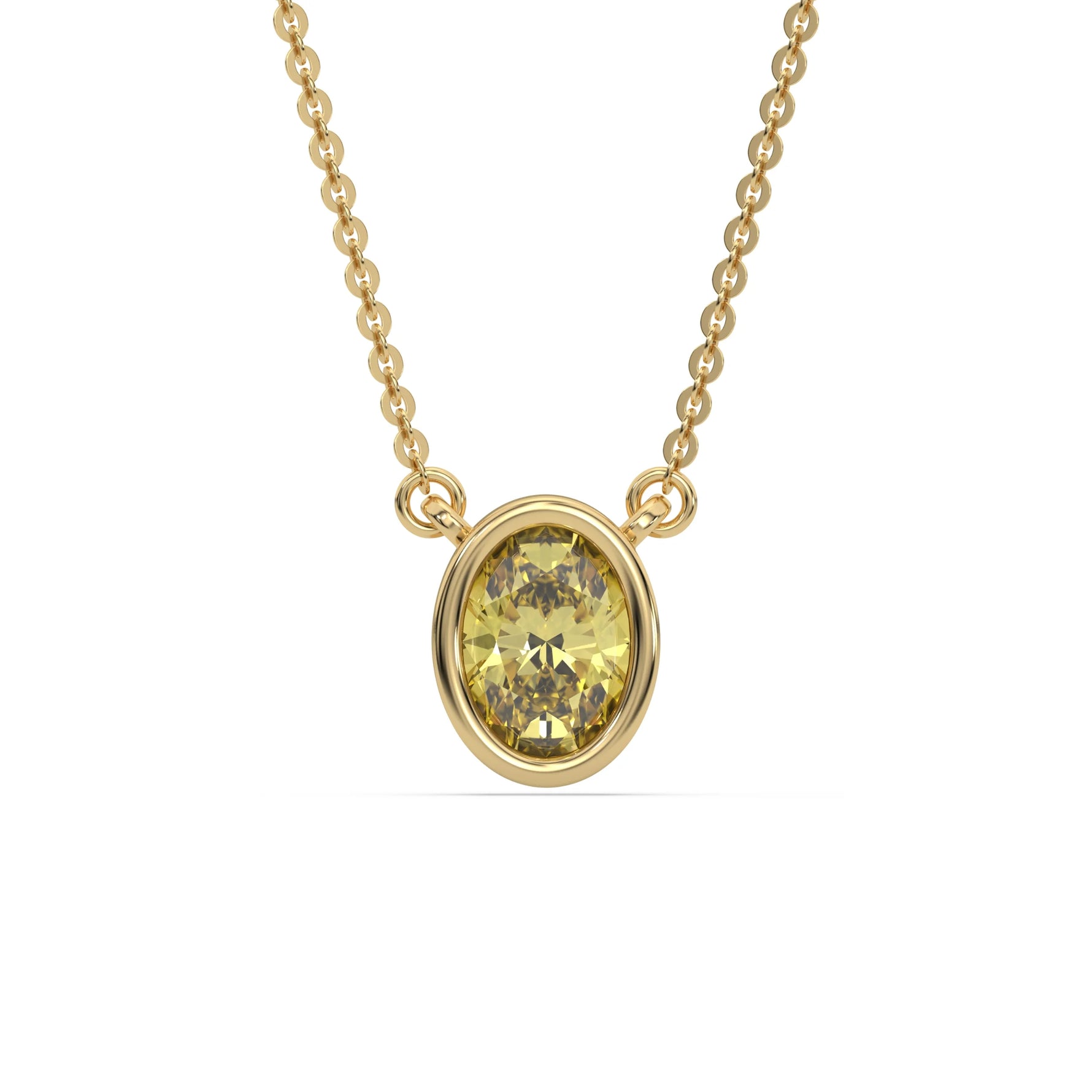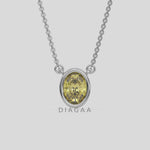 Fancy Yellow Oval Solitaire Diamond Necklace made with an fancy yellow oval cut diamond in bezel setting with adjustable chain.