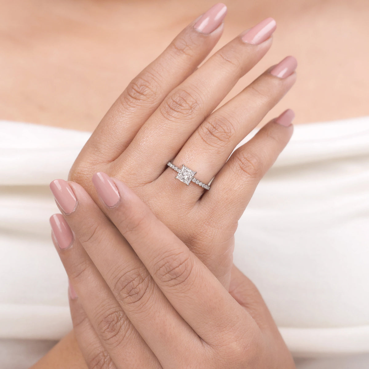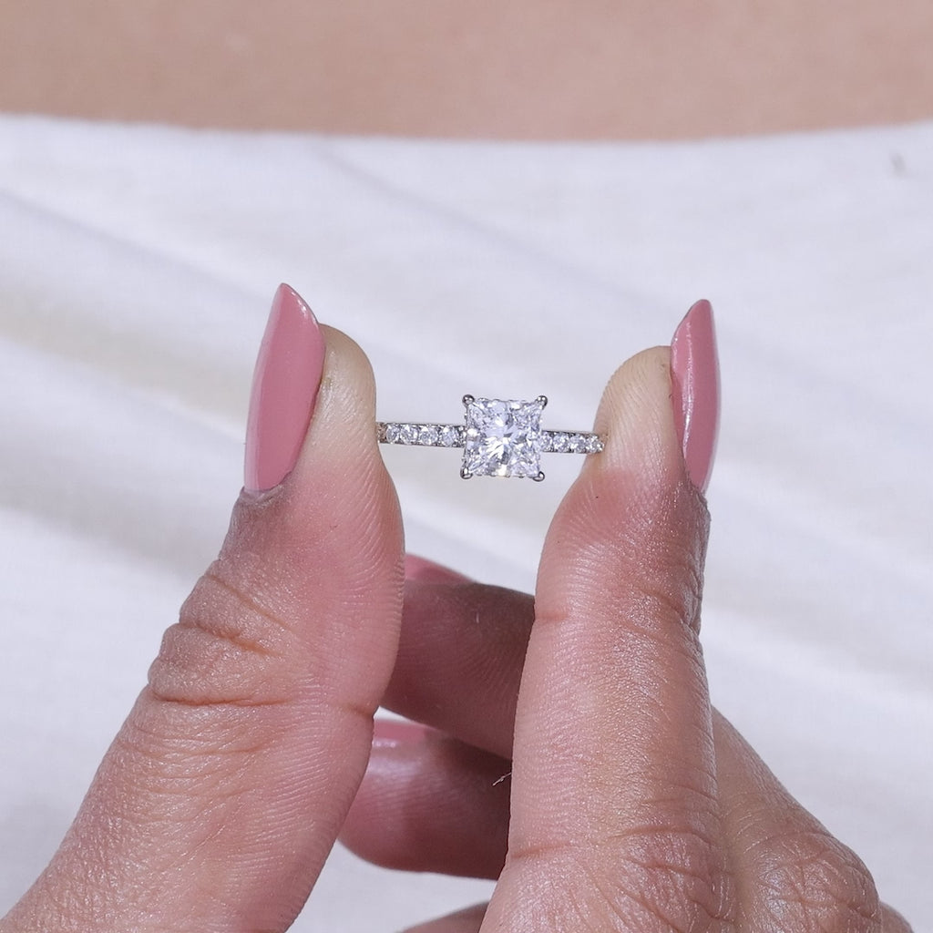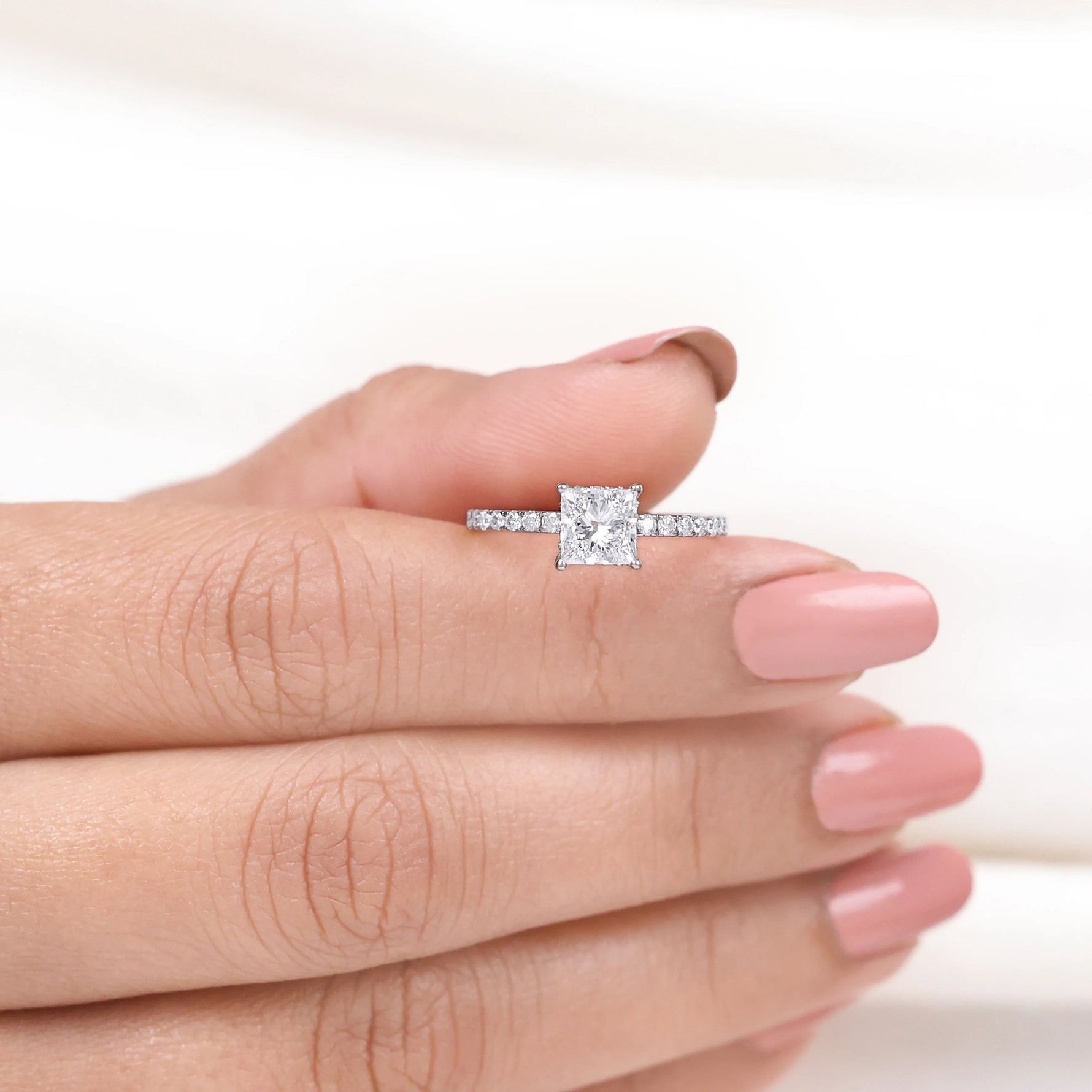 Celebrate forever with a ring that balances meaning, artistry, and brilliance. This princess cut halo engagement ring is not only eye-catching but also versatile, pairing beautifully with our wedding rings for women to create a complete bridal look. Thoughtful details like the hidden halo and micro pave band make it a piece that shines as brightly as your love.