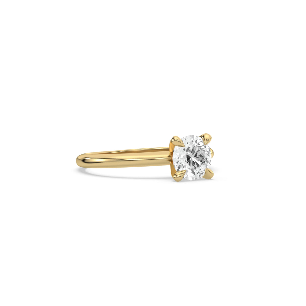 This ring features a round solitaire diamond elegantly secured in a four-prong setting on a solid gold band for a classic and timeless look.