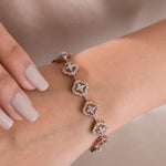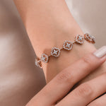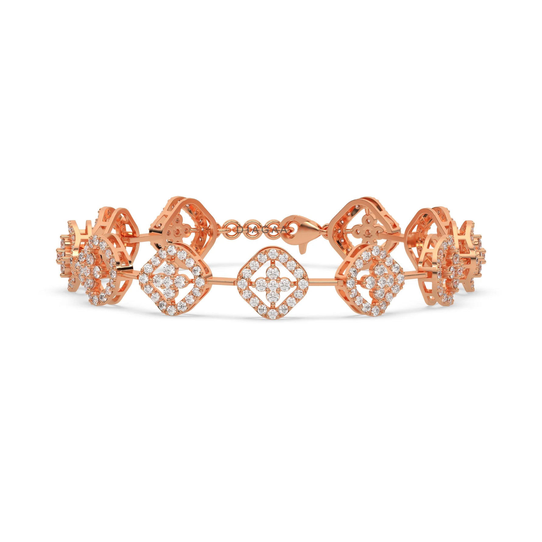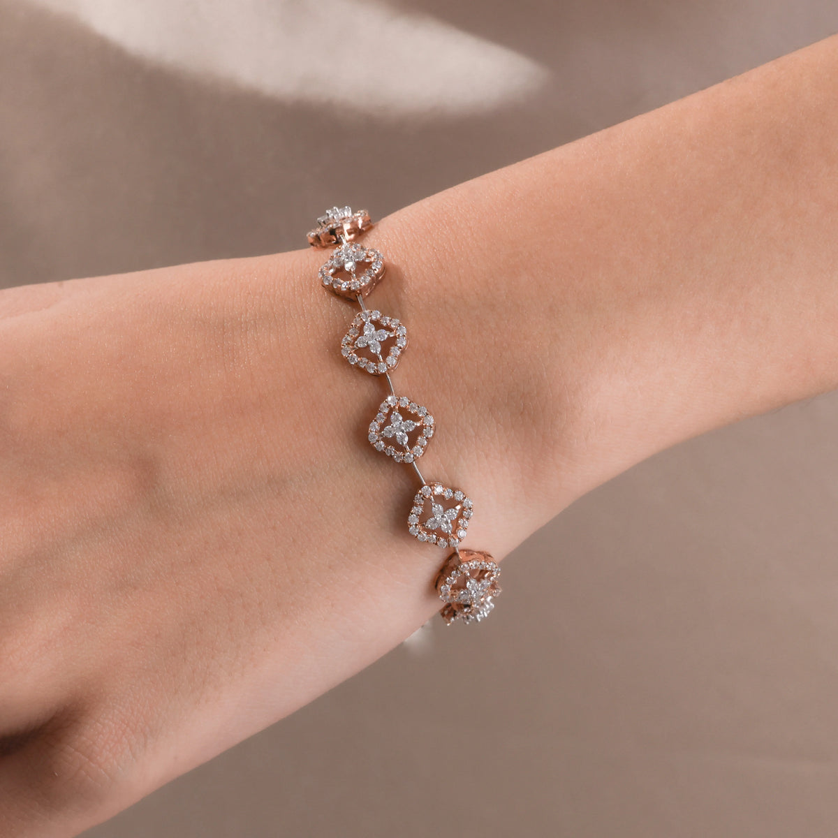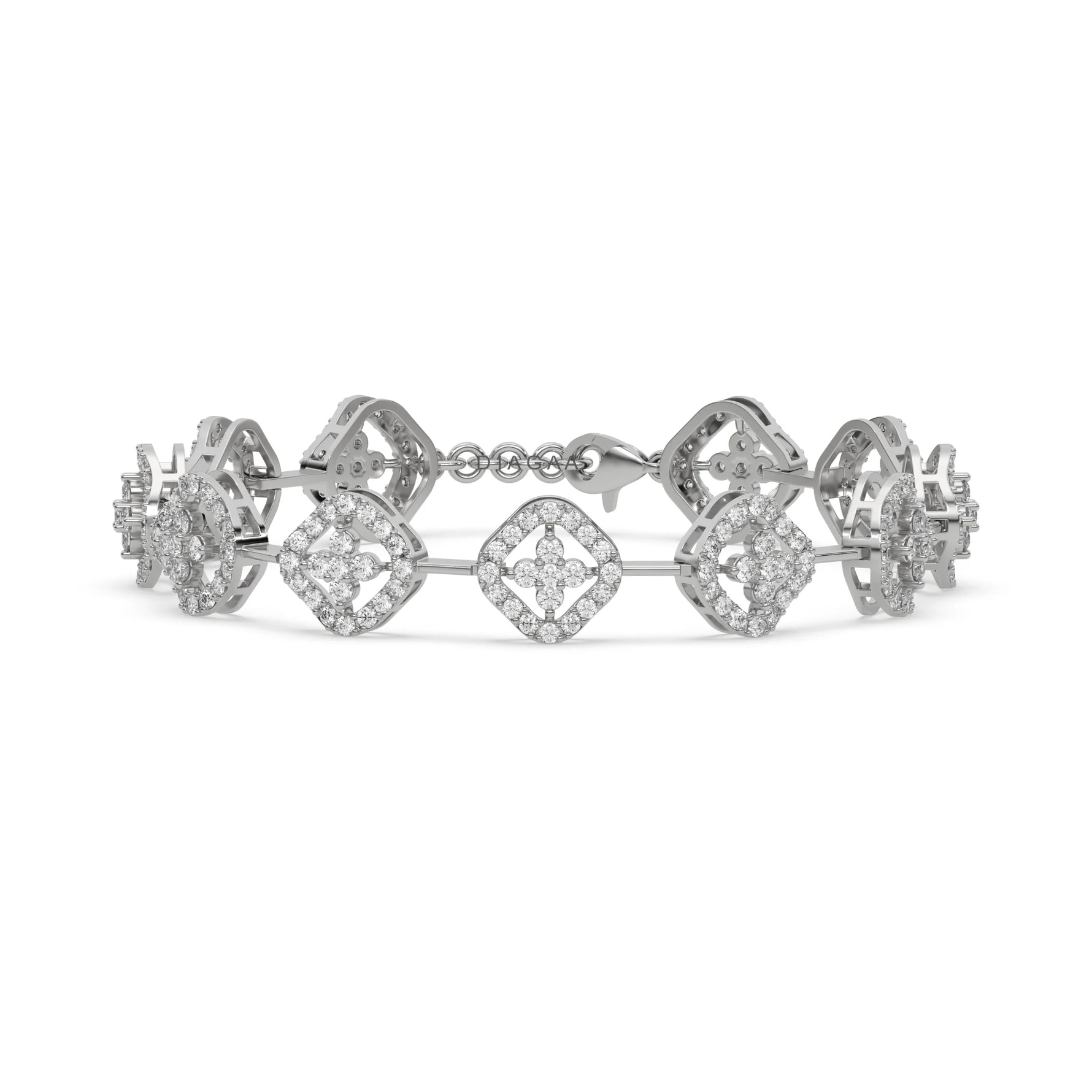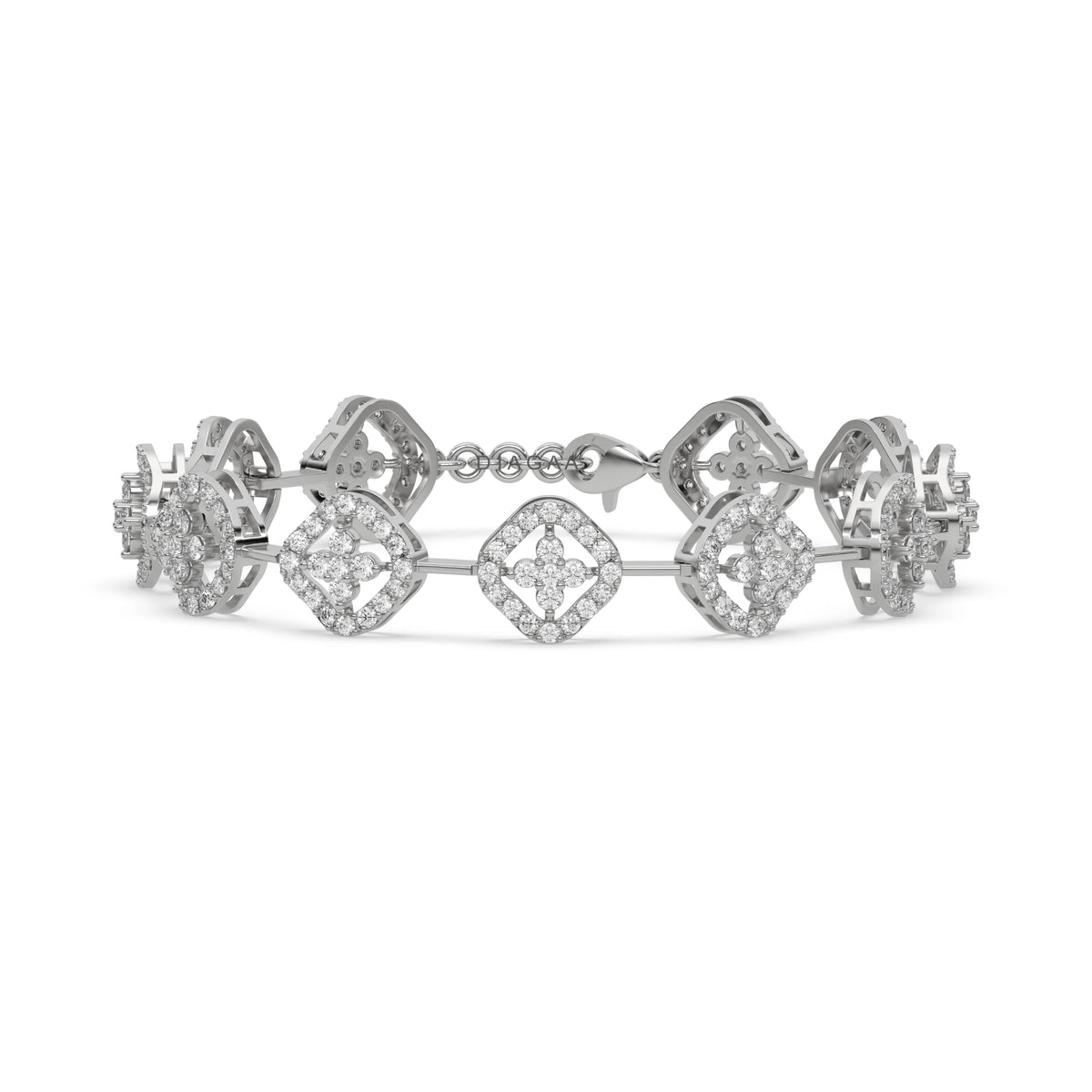 This diamond link bracelet features unique geometric links, with each one showcasing a cluster of round brilliant-cut diamonds arranged in a beautiful, clover-like shape.