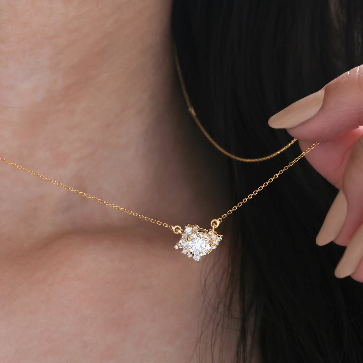 A round, brilliant-cut diamond is used as the focal point, surrounded by a delicate and intentionally imperfect half halo of smaller round diamonds. All the stones are set in prongs, allowing for maximum light reflection.