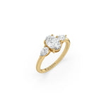 The design blends tradition with modern craftsmanship. The oval diamond takes center stage, elongated to capture light beautifully, while the pear-shaped side stones frame it with subtle elegance. A polished gold band completes the piece, giving it strength and timeless appeal. Available in 1ct and 2ct sizes for the focal diamond, each stone is chosen for its brilliance and fire. This ring fits seamlessly into collections of solitaire diamond rings and works perfectly for women seeking side stone diamond rings with a refined twist. Whether you’re drawn to the symbolism of the three stones or the graceful proportions of the oval cut, this design embodies both romance and style.
